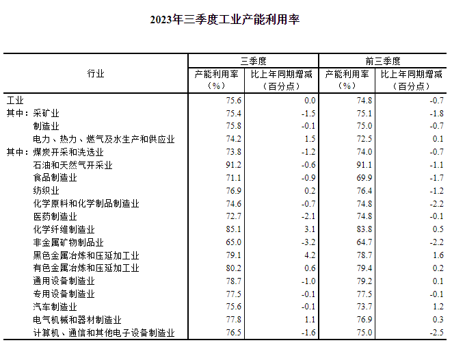 分主要行业看,三季度,煤炭开采和洗选业产能利用率为73.8%,食品制造业为71.1%,纺织业为76.9%,化学原料和化学制品制造业为74.6%,非金属矿物制品业为65.0%,黑色金属冶炼和压延加工业为79.1%,有色金属冶炼和压延加工业为80.2%,通用设备制造业为78.7%,专用设备制造业为77.5%,汽车制造业为75.6%,电气机械和器材制造业为77.8%,计算机、通信和其他电子设备制造业为76.5%。