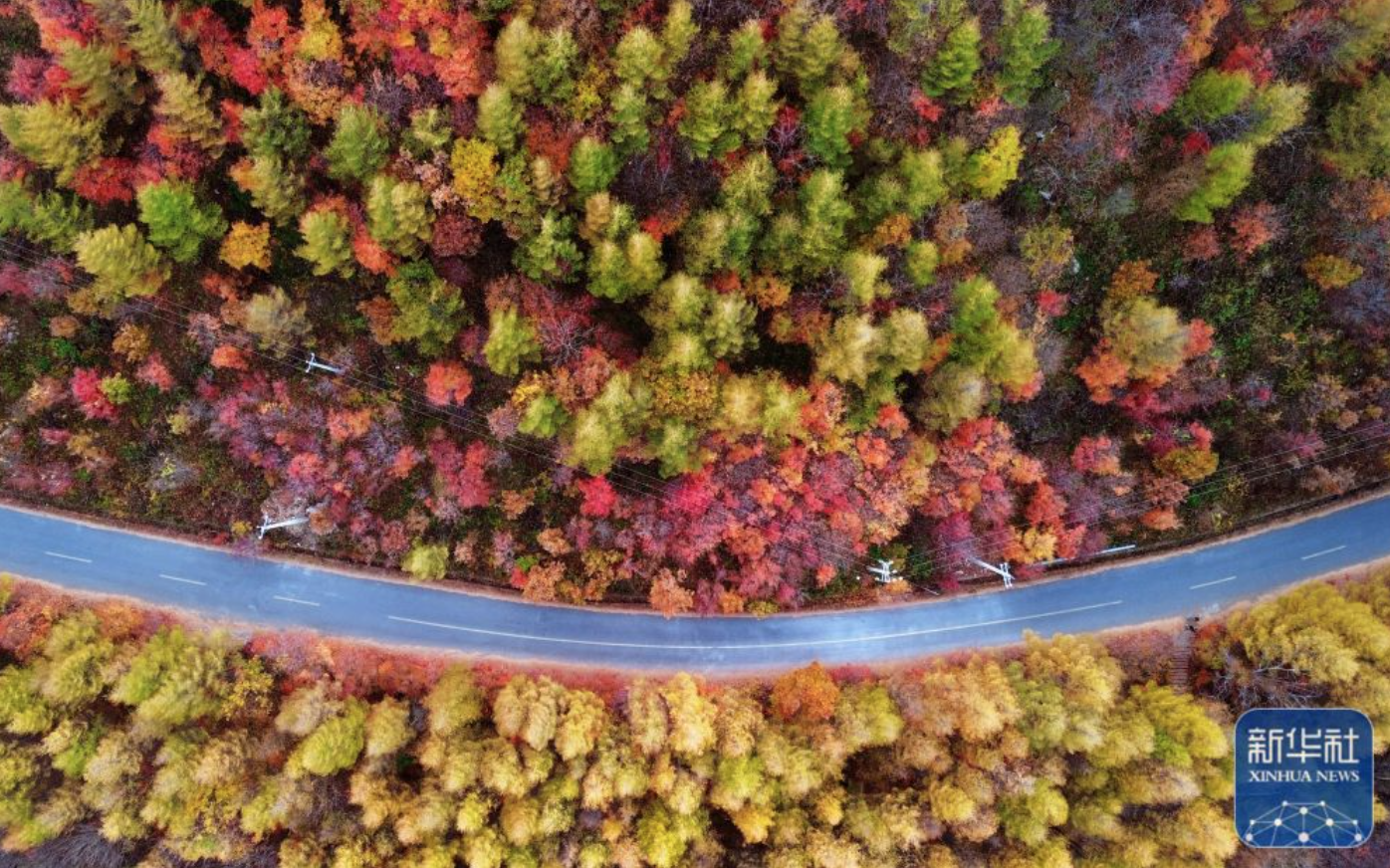 这是10月16日在辽宁省本溪满族自治县老边沟景区拍摄的枫叶林(无人机照片)。新华社记者 陈为 摄