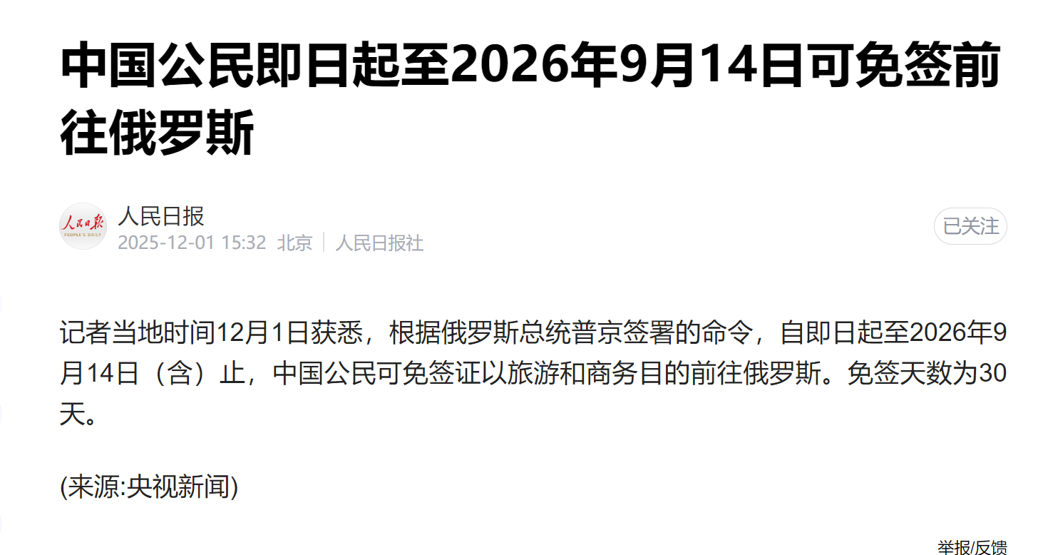 12月1日起,中国公民去俄罗斯终于可以“说走就走”了。俄罗斯总统普京签署命令,对中国普通护照持有人实施为期10个月的免签政策,单次停留不超过30天,消息一出,社交平台上有关俄罗斯的旅游攻略和行程安排等搜索量应声翻倍,旅游平台数据显示,俄罗斯相关机票搜索量在免签政策发布后瞬时激增,“出国冰雪游”热度高涨。