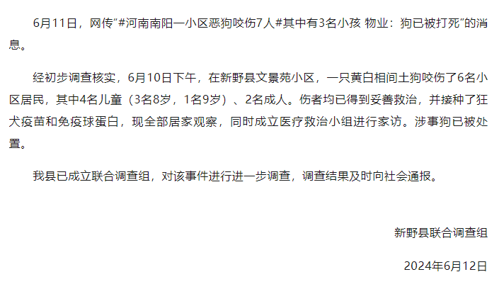 经初步调查核实,6月10日下午,在新野县文景苑小区,一只黄白相间土狗咬伤了6名小区居民,其中4名儿童(3名8岁,1名9岁)、2名成人。伤者均已得到妥善救治,并接种了狂犬疫苗和免疫球蛋白,现全部居家观察,同时成立医疗救治小组进行家访。涉事狗已被处置。