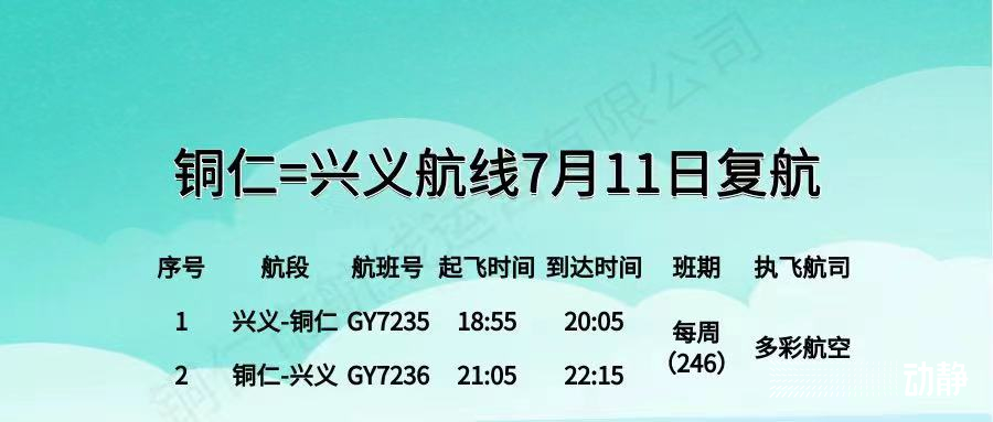 由多彩航空执飞的铜仁=兴义航线,航班号为GY7236/GY7235,班期为每周三班(246),机型为E190,具体起降时刻为18:55从兴义起飞,20:05到达铜仁;21:05从铜仁起飞,22:15到达兴义。