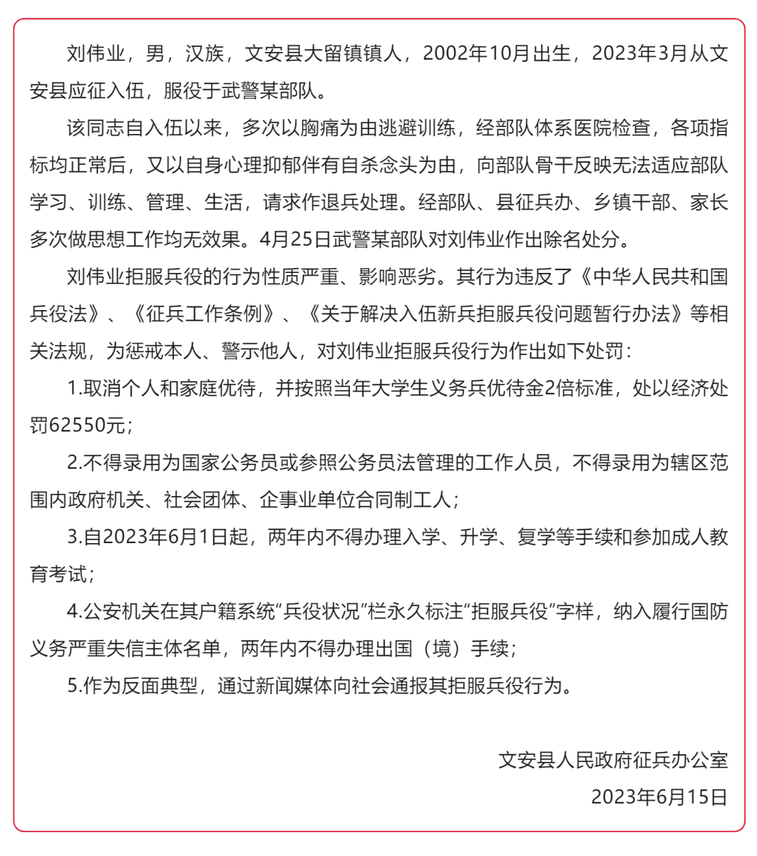7月20日,“文安融媒”微信公众号发布关于该县新兵刘伟业拒服兵役的情况通报,全文如下: