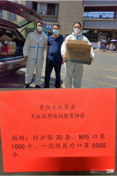 贵阳市天柱商会和天柱筑梦远扬教育协会了解到观山湖金阳社区抗疫物资紧缺,积极为社区工作人员和志愿者协调医疗抗疫物资,9月6日下午,在市工商联的领导下,为市工商联、金阳社区捐赠一次性医用口罩5000个,N95口罩1000个,防护服30套。