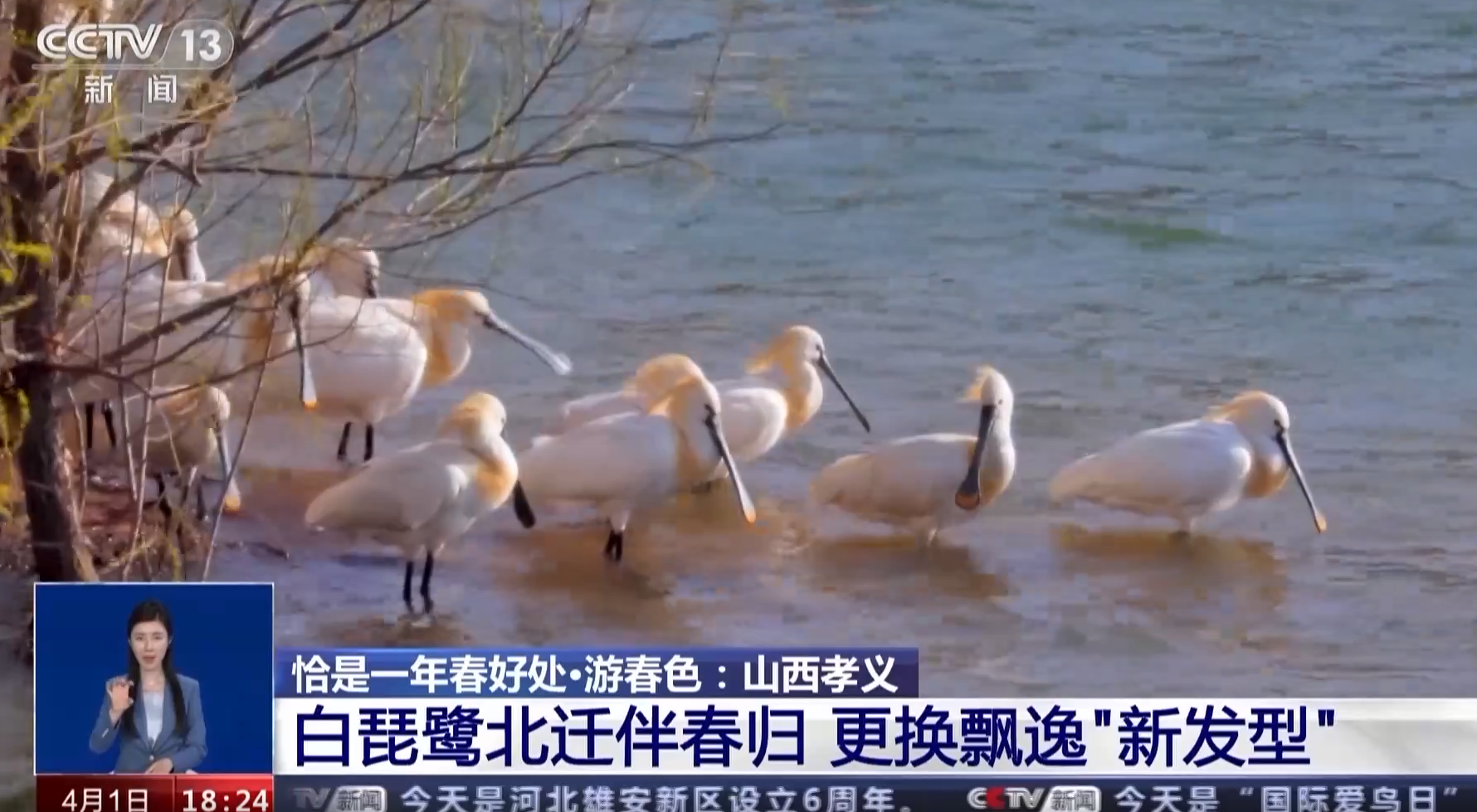 山西孝义:白琵鹭北迁伴春归 更换飘逸“新发型”