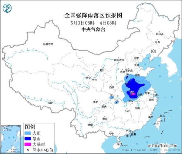 预计,5月3日08时至4日08时,河南中东部、山东西部和南部、安徽中北部、江苏中北部、湖北南部和中东部、重庆北部等地部分地区有大到暴雨,其中,河南东南部、湖北东北部、安徽西南部等地局地有大暴雨(100~120毫米)。上述部分地区伴有短时强降水(最大小时降雨量20~40毫米,局地可超过50毫米),局地有雷暴大风等强对流天气。