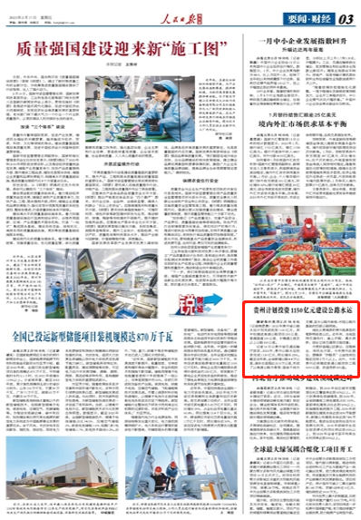 今天(2月17日),《人民日报海外版》刊发新闻,文章提到,2023年贵州省公路水运计划完成投资1150亿元,其中拟建成高速公路项目200公里、普通国道100公里、乡镇通三级及以上公路500公里。