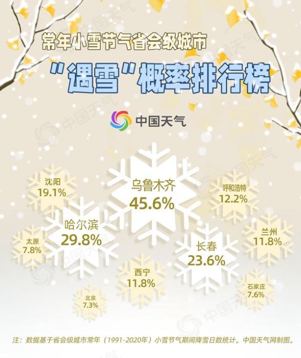 中国天气网统计了1991年至2020年省会级城市的降雪数据,小雪节气期间,乌鲁木齐平均降雪日数能达到6.8天,“遇雪”概率超过四成,哈尔滨和长春“遇雪”概率分别为29.8%和23.6%。此外,沈阳、呼和浩特、西宁、兰州这个节气的降雪概率也有一二成。