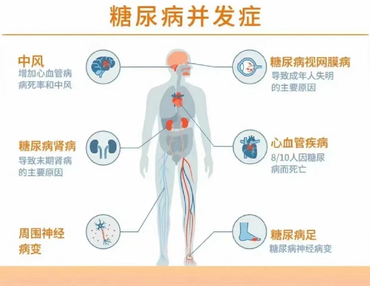 糖尿病会影响全身各器官系统,引起并发症及相应的症状↓↓