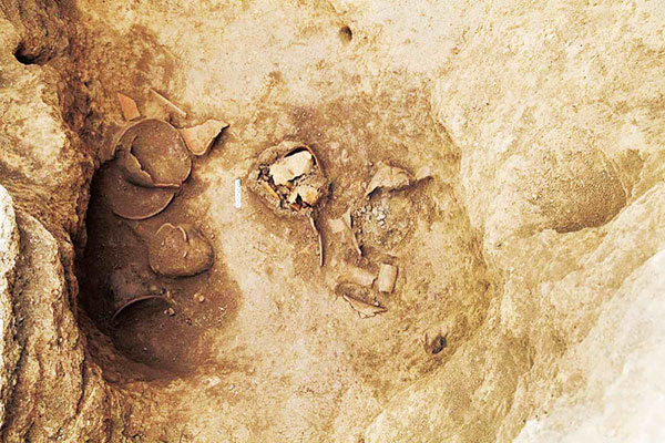 “在陶窑东、西分布密集区发现与制坯密切相关的遗迹以及窖穴类生活遗迹,故这一区域可能是制坯区和生活区,遗址可能是分区制坯和烧制陶器的。如在其中两个探方内发现与制坯密切相关的水井遗迹和灰坑,附近也有袋状窖穴。”付仲杨介绍,在这一区域还发现了与制陶遗址年代相同、葬式均为俯身的直肢葬式、墓向为东西向或南北向的墓葬,在个别墓葬内还出土有夹砂褐陶疙瘩鬲。