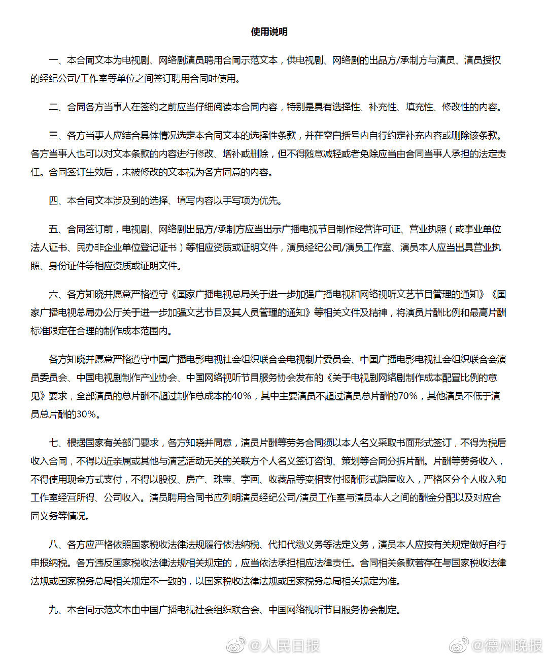 7日,中国广播电视社会组织联合会、中国网络视听节目服务协会发布《演员聘用合同示范文本(试行)》。使用说明中提到,演员片酬等劳务收入,不得使用现金方式支付,不得以股权、房产、珠宝、字画、收藏品等变相支付报酬形式隐匿收入,严格区分个人收入和工作室经营所得、公司收入。演员聘用合同书应列明演员经纪公司/演员工作室与演员本人之间的酬金分配以及对应合同义务等情况。