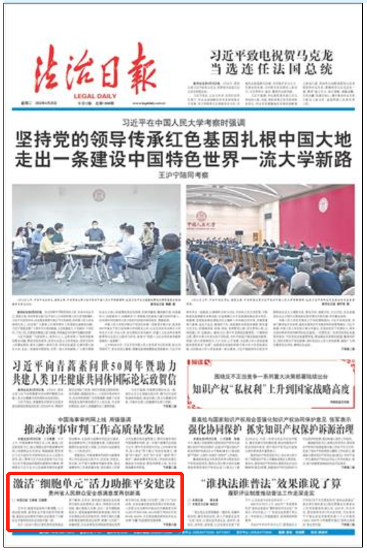 今天的《法治日报》头版,报道了贵州紧盯基层社会治理和市域社会治理难点、堵点,持续深化改革创新,强化智能化支撑,出台一系列增强基层活力、提高基础保障的政策措施,为实现疫情防控和经济社会发展“双赢”局面提供坚强保障。