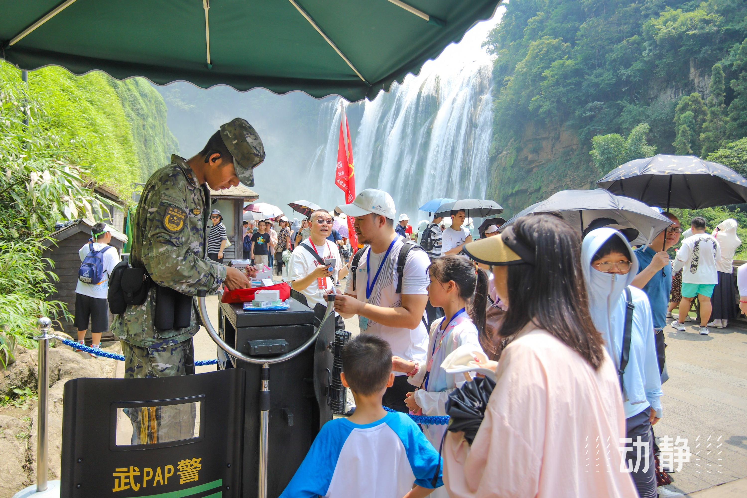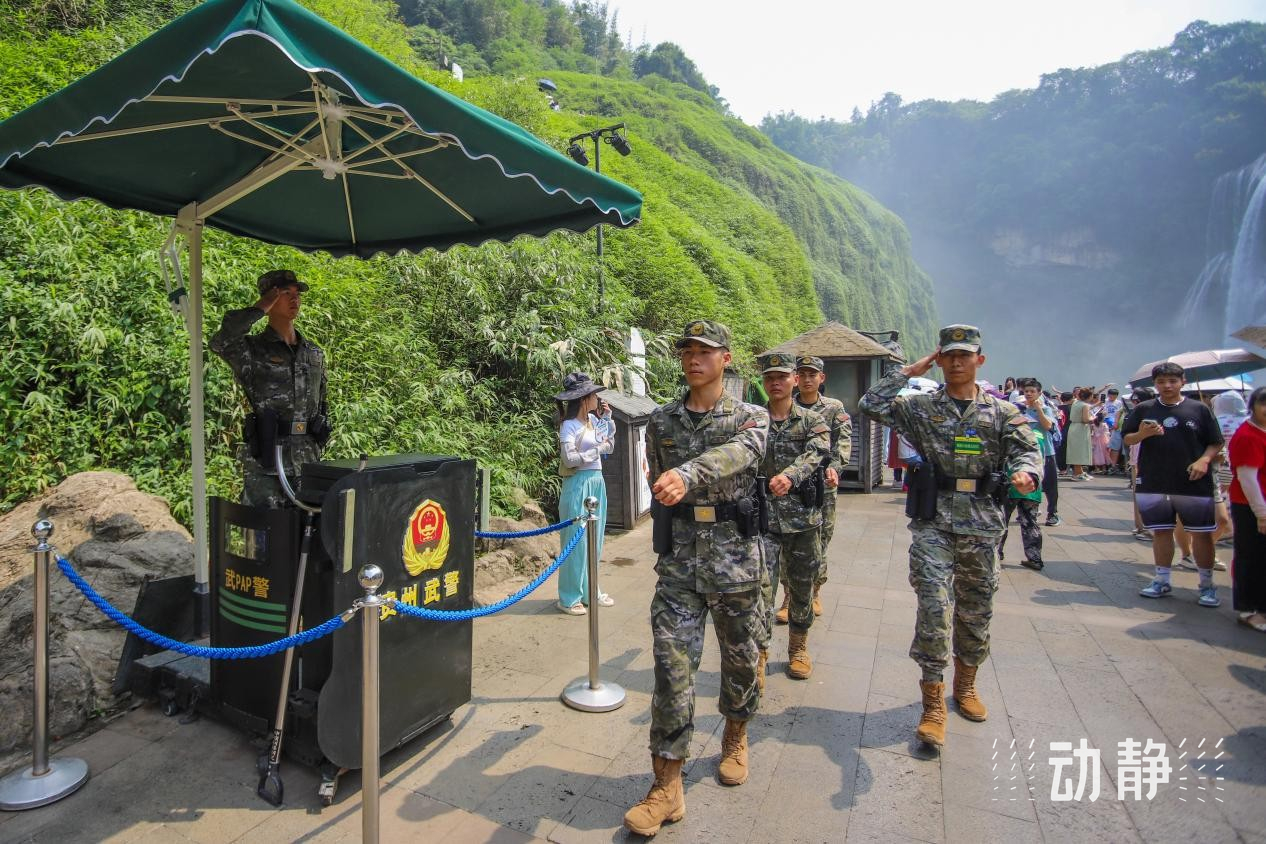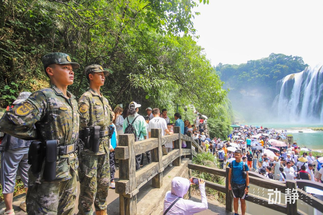 暑期以来,黄果树景区作为热门旅游景点之一,吸引了众多游客前来旅游观光。为保证游客出行安全,武警贵州总队安顺支队的官兵们坚守在执勤一线,全时守护游客游览安全。