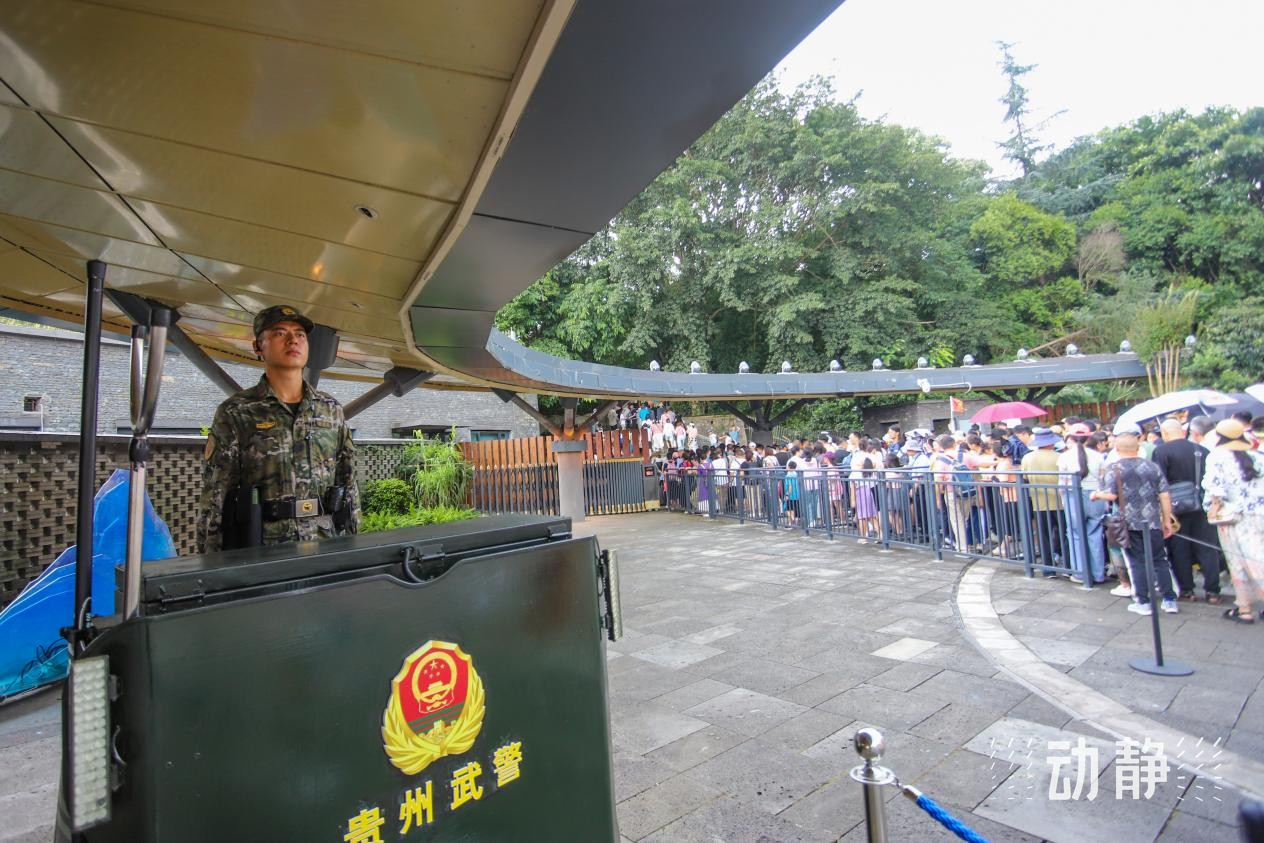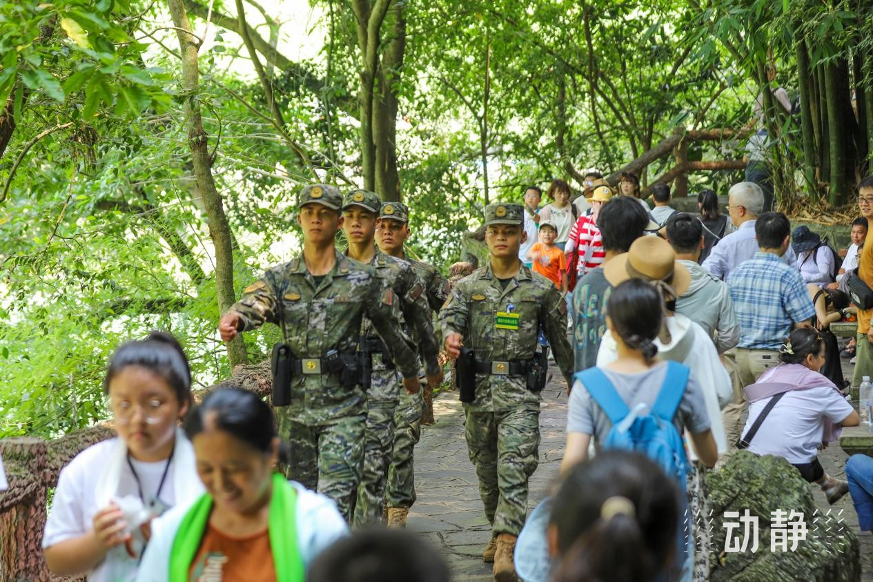 在拥堵的人群中,武警官兵们各司其职、密切配合,协同景区工作人员为游客提供问询、应急救护等便民服务,全力确保游客安全。