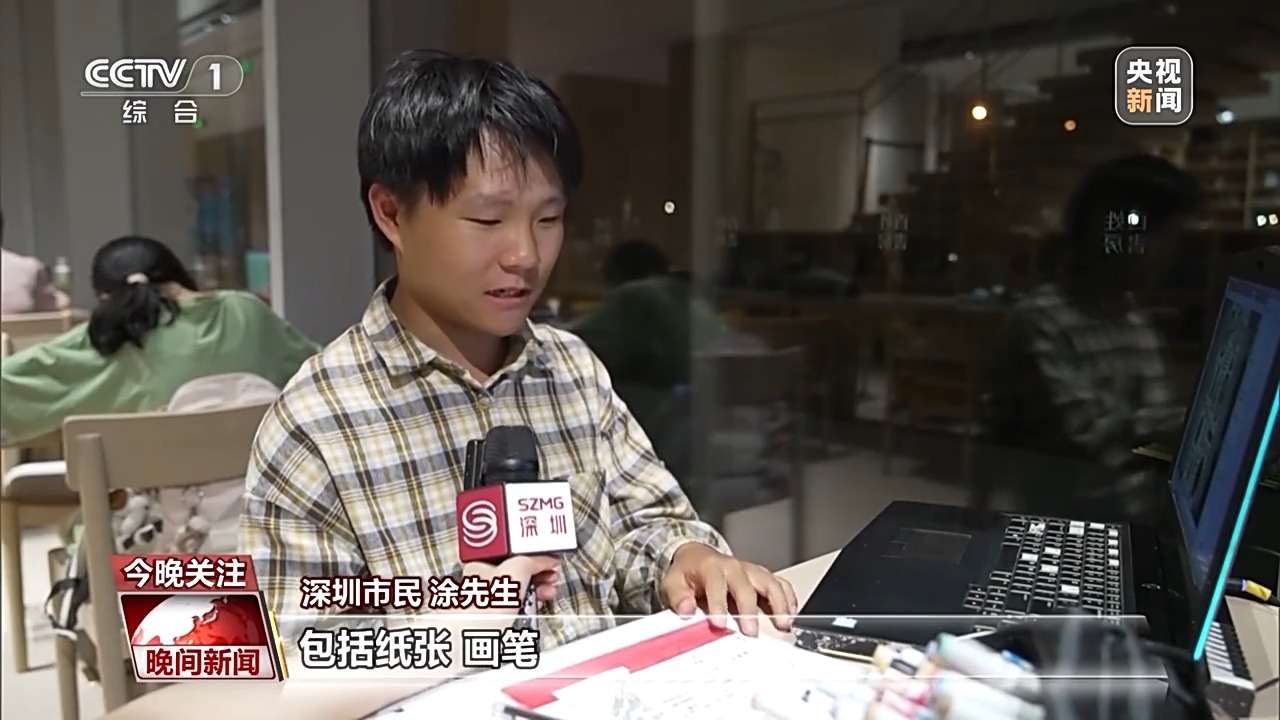深圳市民 涂先生:我的材料很多,包括纸张,画笔,我还用到电脑,这里有一张很大的桌子,很适合我。