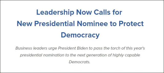 据报道,由数百名商界领袖组成的组织“Leadership Now Project”致信白宫,建议美国现任总统放弃竞选连任。