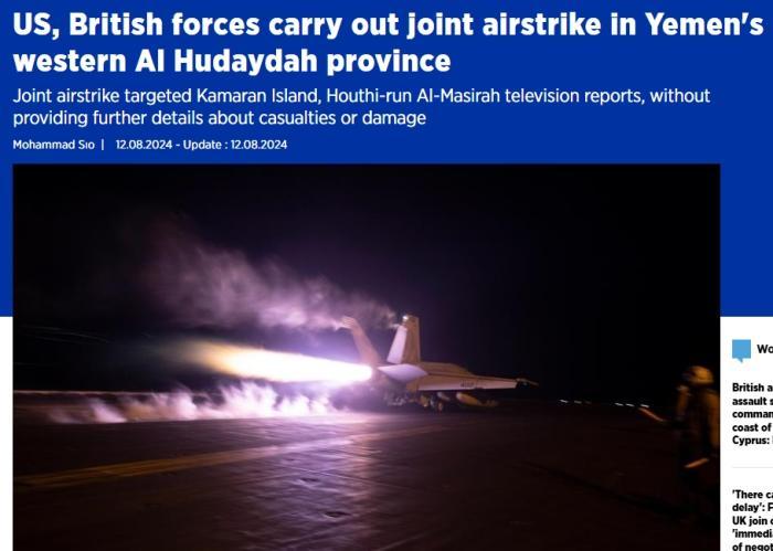 综合外媒报道,也门胡塞武装表示,当地时间12日,美军和英军对也门西部荷台达省实施了联合空袭。