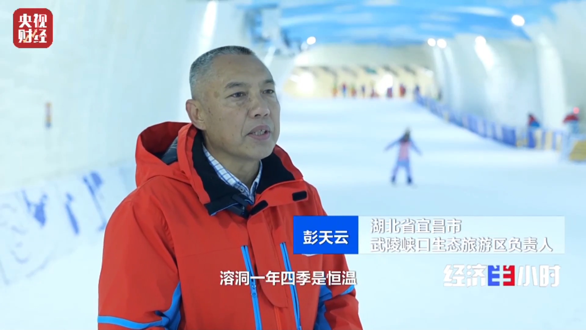 湖北省宜昌市武陵峡口生态旅游区负责人 彭天云:溶洞一年四季恒温,大概十三四摄氏度,和其他室内滑雪场相比,运行成本至少要低30%。