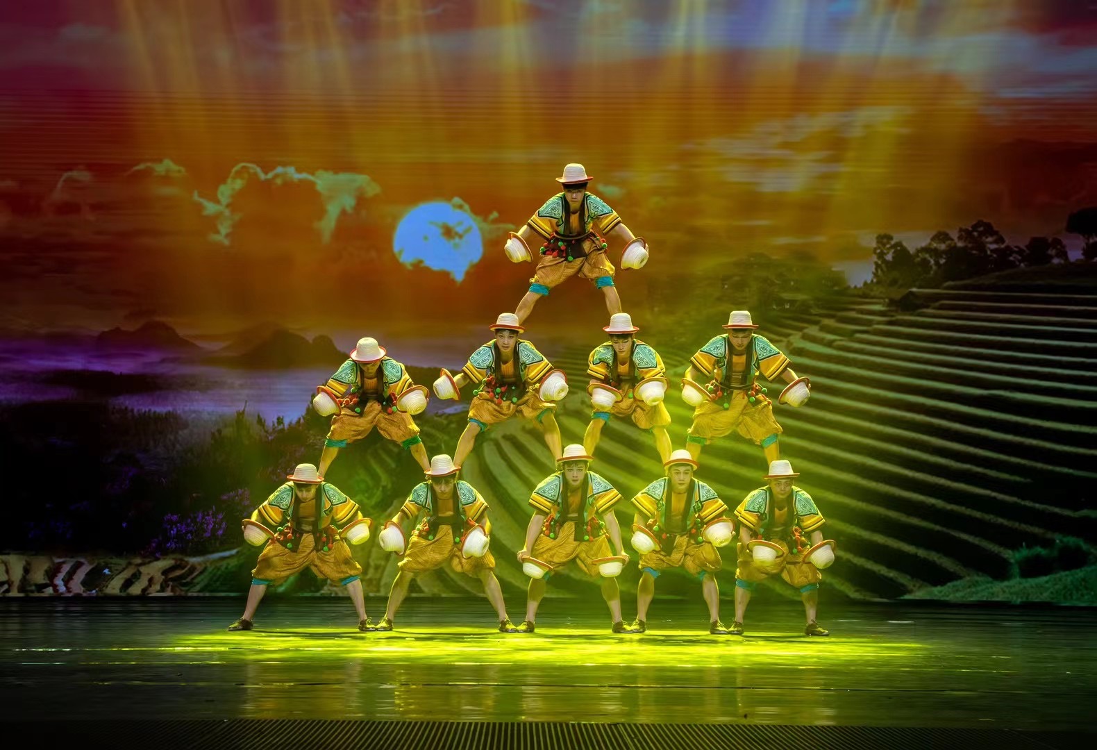 在“临河佳酿”一幕中,美丽神秘的赤水河畔,一场豪放酣畅的斗酒比赛正在进行,多名演员联袂表演了精巧、高难的杂技——顶缸。一只只青花瓷“酒坛”在演员们的手中、背上旋转、翻滚,一阵阵醉人的酒香传来,让观众感受到了“风来隔壁三家醉,雨后开瓶十里香”的魅力。