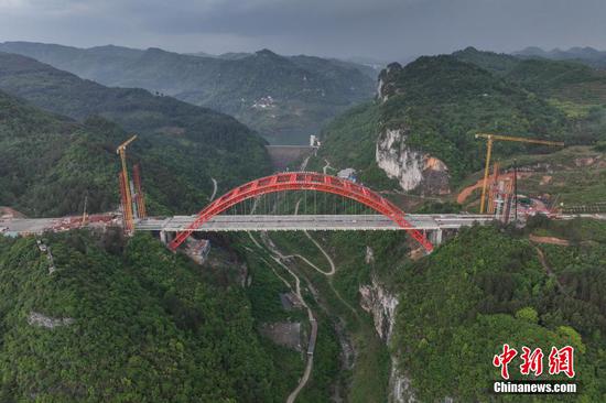 5月4日,航拍建设中的贵州贵(阳)平(塘)高速公路马场河特大桥。马场河特大桥位于贵州省黔南布依族苗族自治州贵定县盘江镇马场河村,为主跨260米的中承式钢管混凝土桁架拱桥,全长381.5米。“五一”假期期间,50余名各个工种的工人坚守岗位、抢抓工期开展大桥尾期建设,以确保大桥能够如期通车。