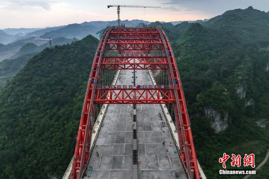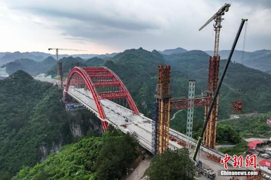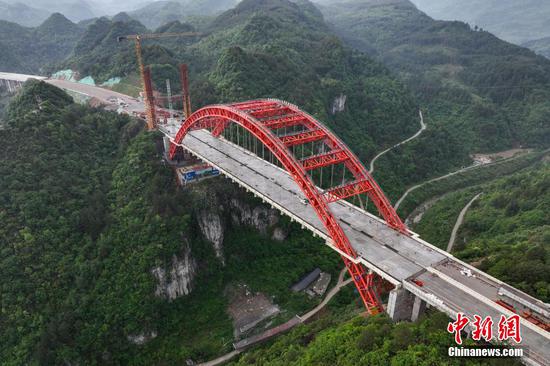 5月4日,航拍建设中的贵州贵(阳)平(塘)高速公路马场河特大桥。马场河特大桥位于贵州省黔南布依族苗族自治州贵定县盘江镇马场河村,为主跨260米的中承式钢管混凝土桁架拱桥,全长381.5米。“五一”假期期间,50余名各个工种的工人坚守岗位、抢抓工期开展大桥尾期建设,以确保大桥能够如期通车。