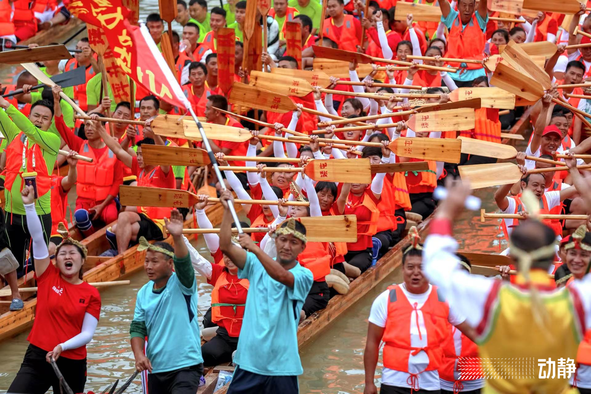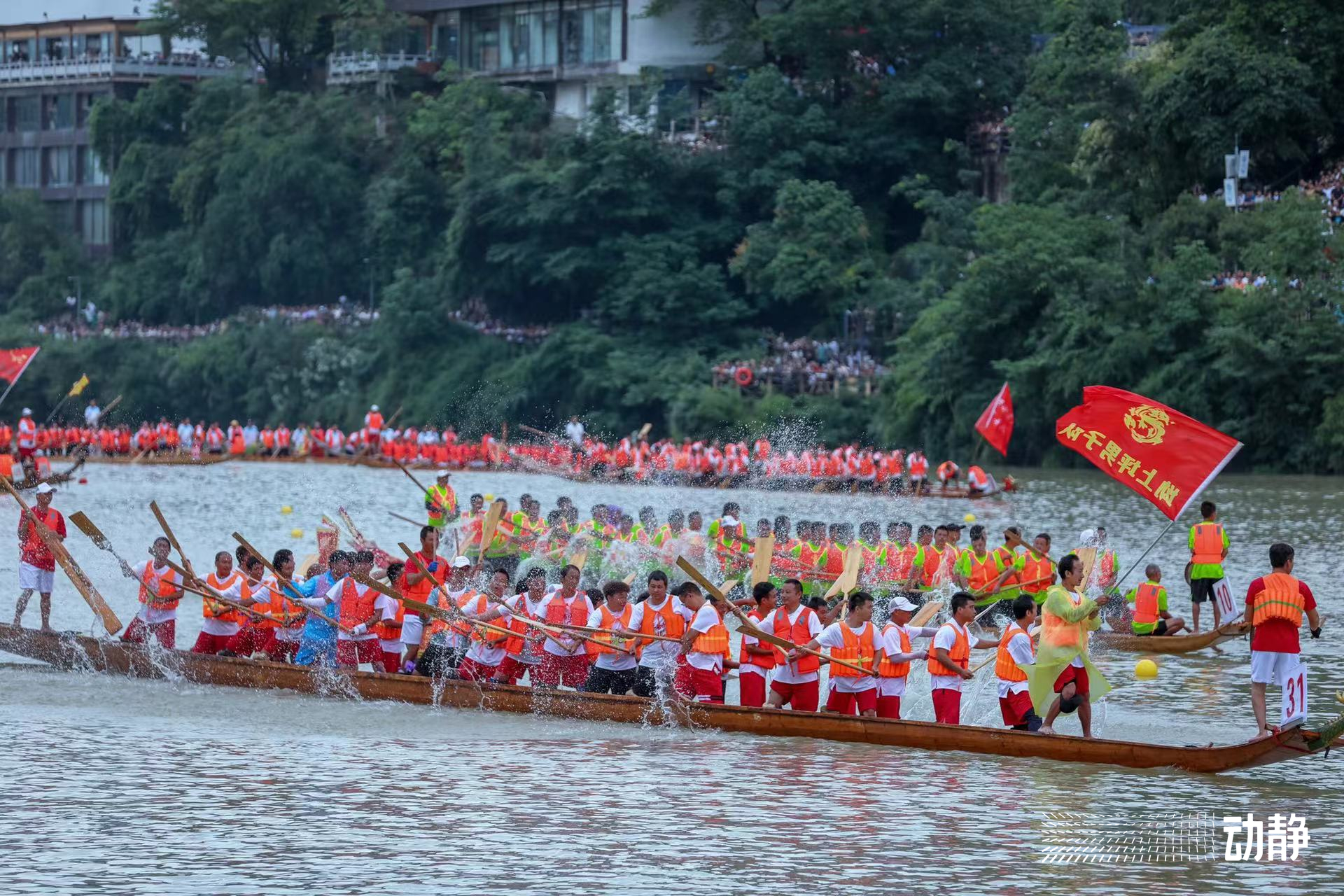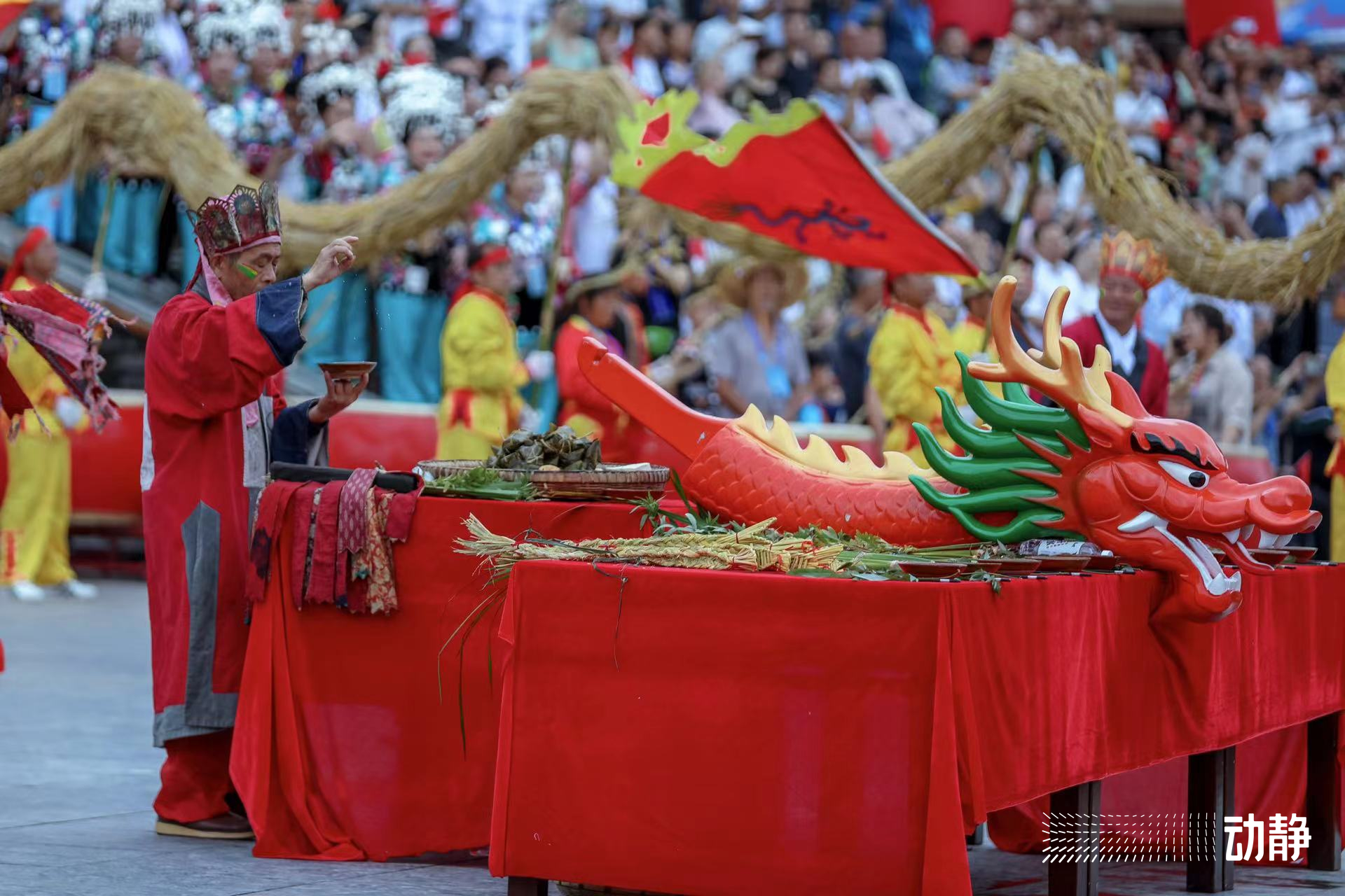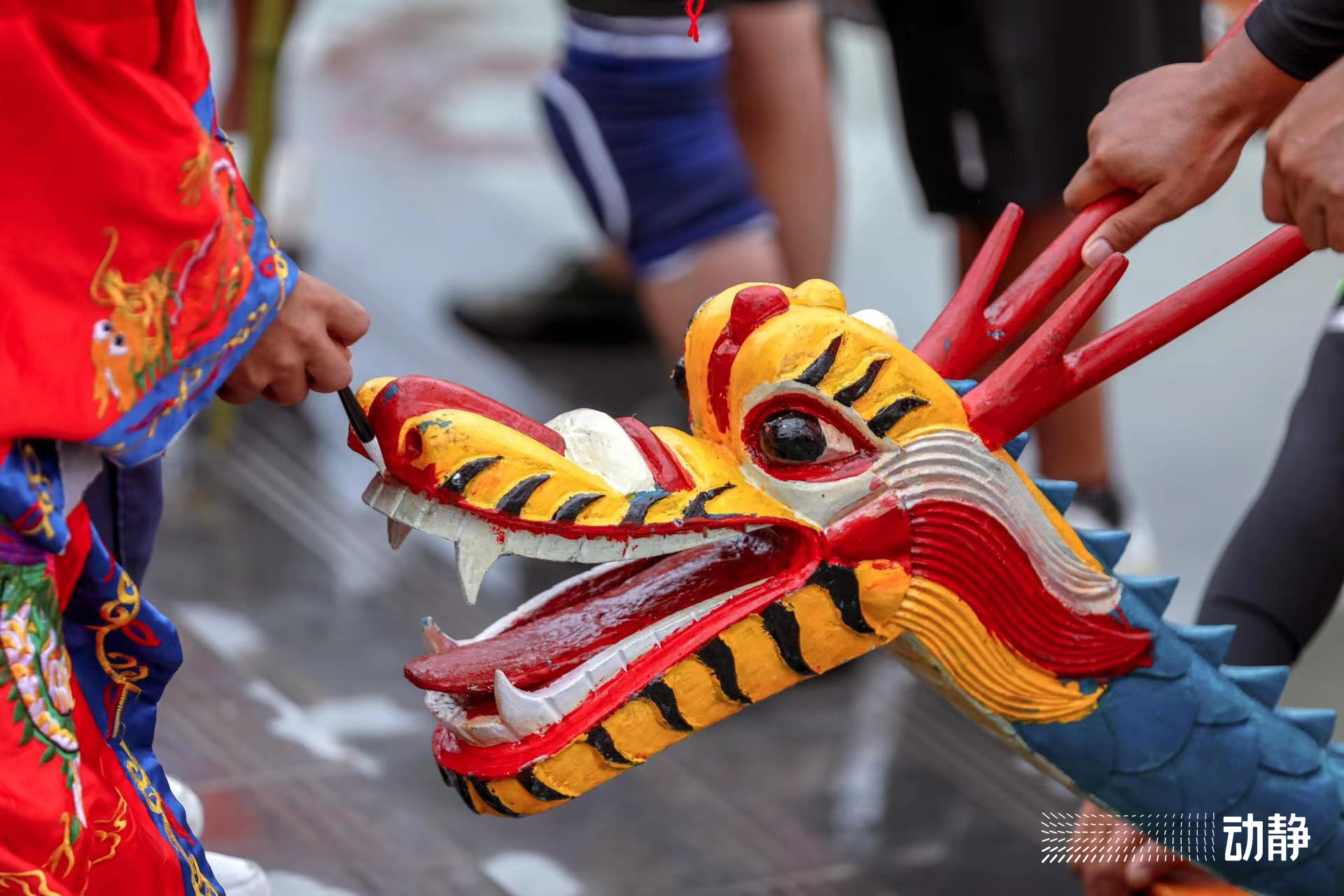 9条完成点睛的龙舟由队员同时送入江中,49条传统龙舟、25艘乌篷船、2条扭龙船依次进场,一边入场一边吆喝、击打水花。全部船只入场后,围成一圈,扭龙船在两侧进行表演。观赏席沿江岸边40面大鼓进行击鼓表演,岸上滚龙与江面船只进行互动。