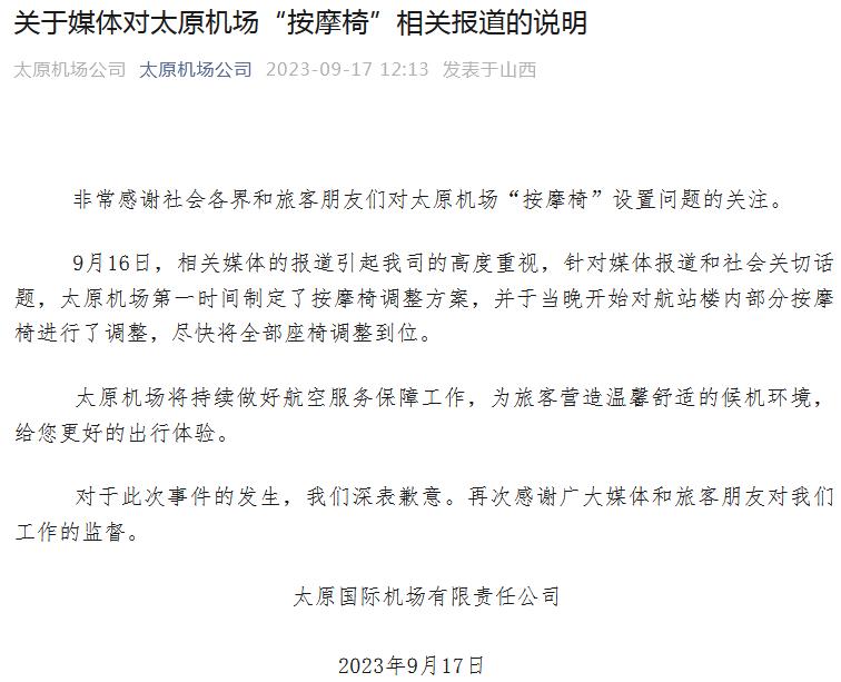 9月16日,相关媒体的报道引起我司的高度重视,针对媒体报道和社会关切话题,太原机场第一时间制定了按摩椅调整方案,并于当晚开始对航站楼内部分按摩椅进行了调整,尽快将全部座椅调整到位。
