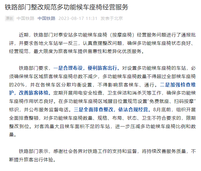 铁路部门要求,一是合理布设,便利旅客出行。对设置多功能候车座椅的车站,必须确保候车区域旅客候车座椅总数不减少,多功能候车座椅数量不得超过全部候车座椅的20%,并在各候车区分散均衡设置,不得影响旅客候车、通行。二是加强检查维护,改善旅客体验。定期开展用电安全检查、卫生保洁和消杀灭等工作,确保多功能候车座椅作用状态良好。在多功能候车座椅区域醒目位置规范设置“免费就座、扫码按摩”标识,并公布服务监督电话。三是全面排查整改,依法合规经营。8月底前,组织开展全面排查整顿,对多功能候车座椅数量、规格、布局、状态、卫生不符合要求的,限期整改到位。对客流量大且候车面积不足的车站,进一步压减多功能候车座椅比例和数量。