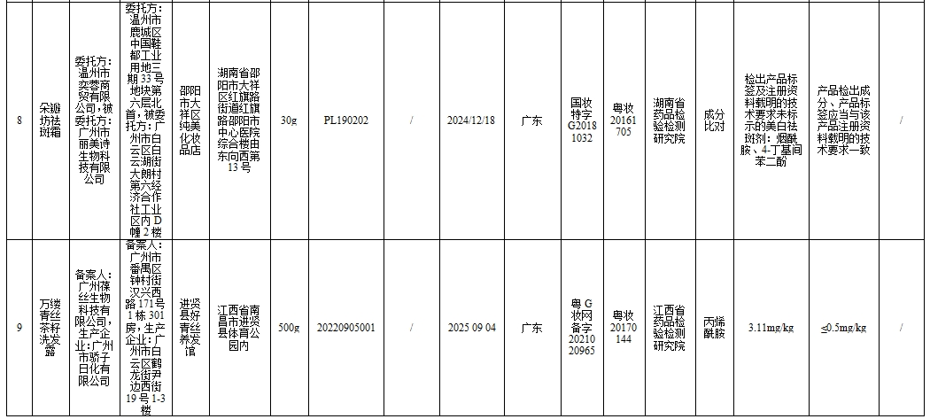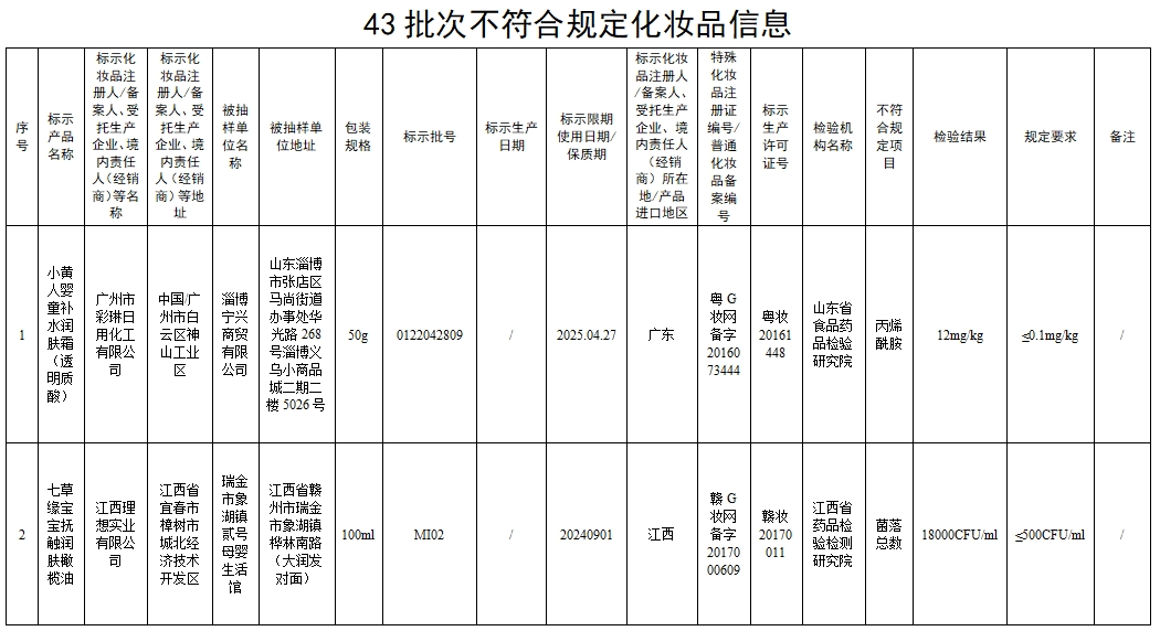在2023年国家化妆品抽样检验工作中,经山东省食品药品检验研究院等单位检验,产品标签标示为广州市彩琳日用化工有限公司生产的小黄人婴童补水润肤霜(透明质酸)等43批次化妆品不符合规定(见附件)。