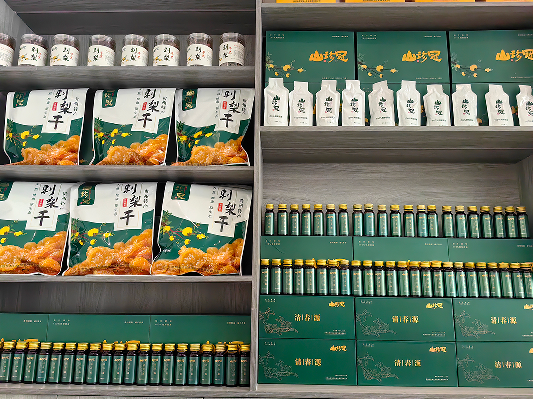贵州山珍冠生态农业发展有限公司董事长余贵举说:“现在我们整个车间总共四条生产线,主要是瓶装口服液、袋装口服液、刺梨原液和刺梨果脯这四大类的生产线,一共有八个产品,在市场上,销售还是比较好。”