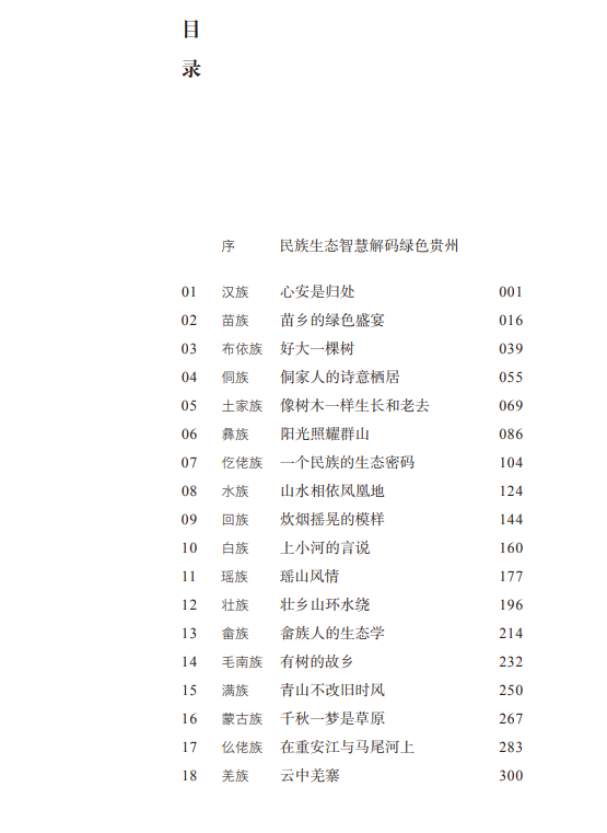 《贵州世居民族的生态智慧》由贵州籍中国作家协会会员采写,著名作家欧阳黔森作序,以18个世居民族的传统文化为主线,采用纪实散文的手法,通过一条以小见大、由家而国、从个体生命体验到爱国主义情感的诗意审美路径,讲述贵州世居民族生产、生活、生态“三生共赢”的生存智慧。