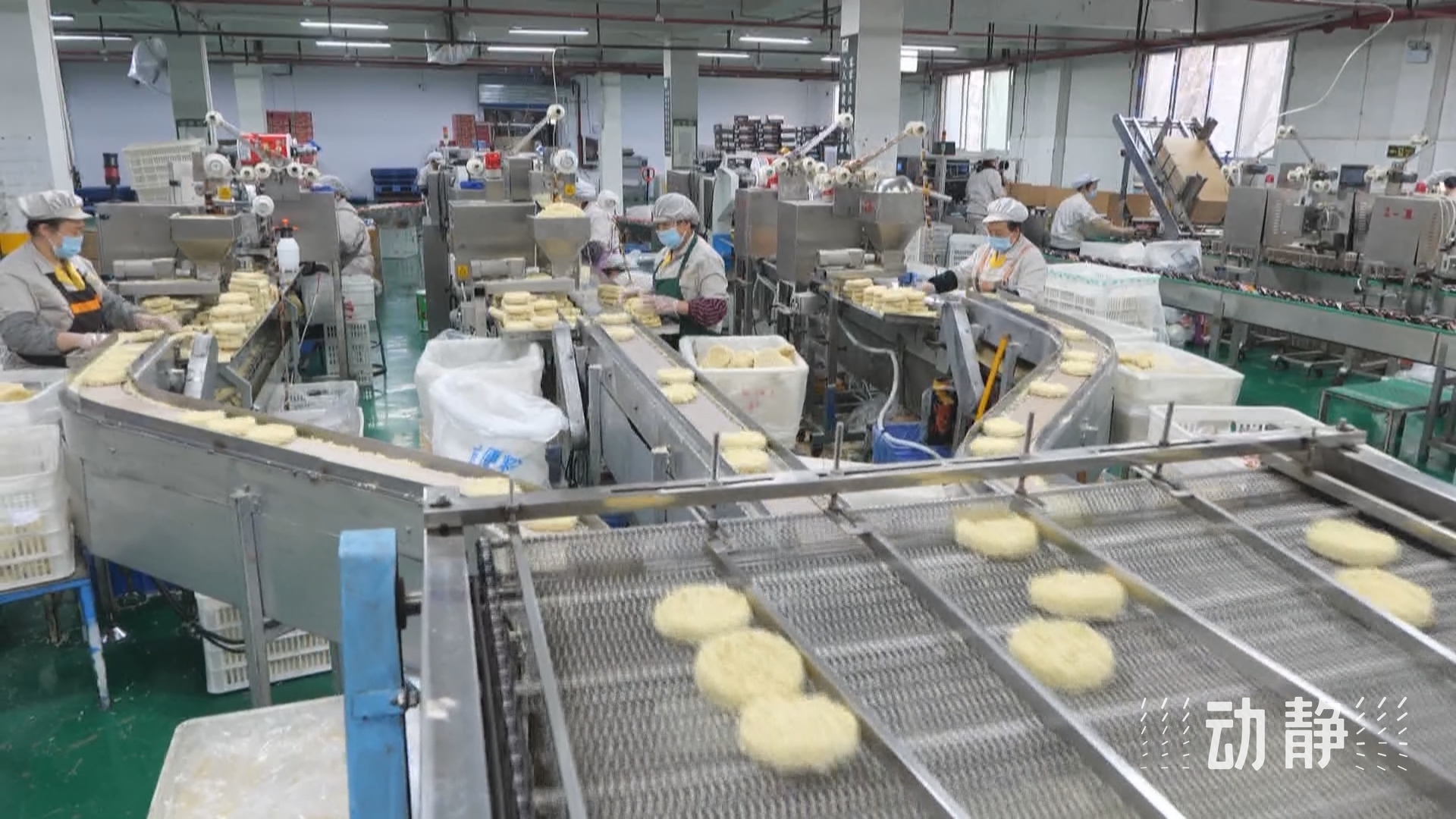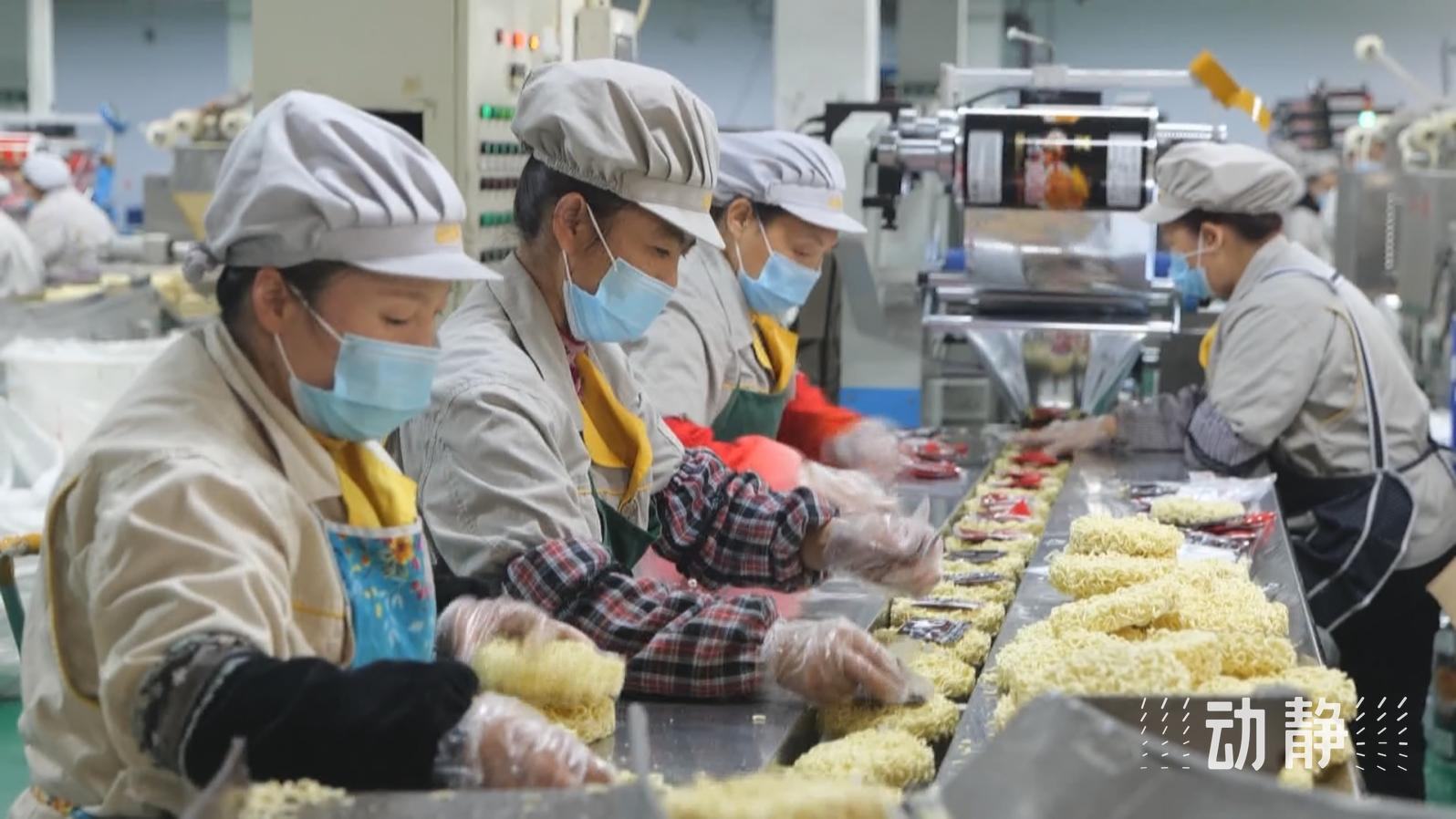 在遵义金紫阳食品公司的生产车间,近百名工人正在生产岗位上忙碌着,随着产线自动化程度提升,一条生产线每分钟能产出12包方便面,日产量达3万包。由于节后订单增长,企业正加大马力赶生产。