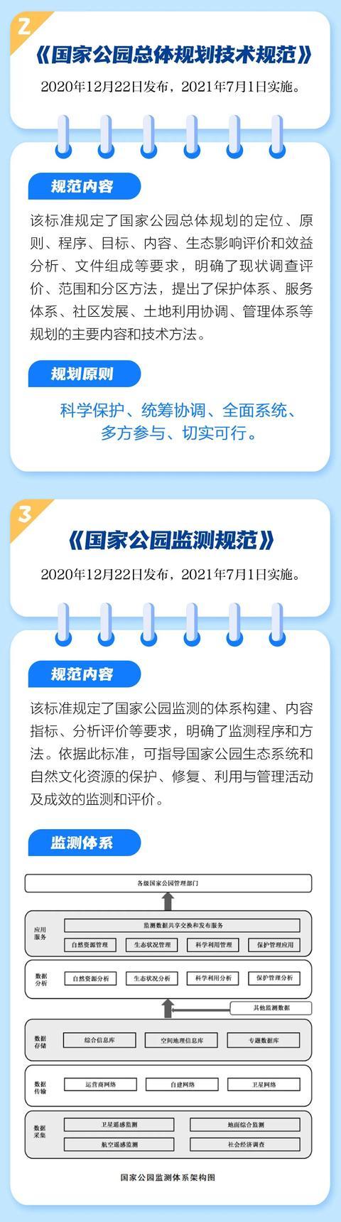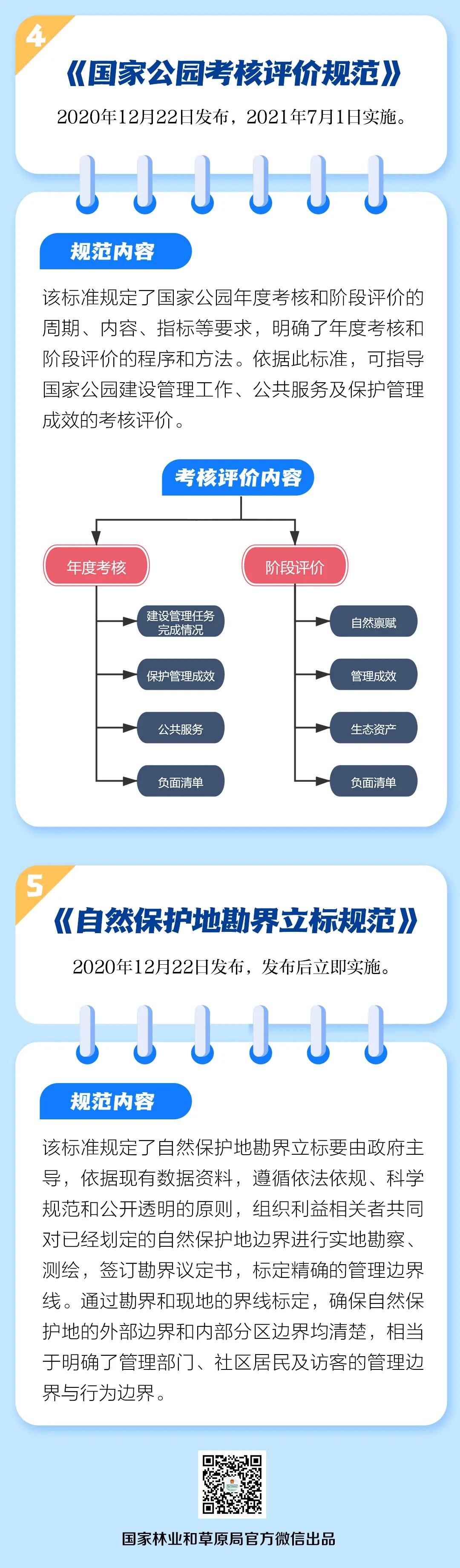 涉及国家公园建设的标准共有5项,分别是《国家公园设立规范》《国家公园总体规划技术规范》《国家公园监测规范》《国家公园考核评价规范》《自然保护地勘界立标规范》。