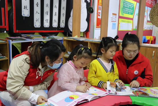 贵州省遵义市持续深化“书香遵义·全民阅读”文化品牌,组织青年志愿者深入辖区各学校开展“阅”读书、“阅”成长实践活动。图为汇川区高桥街道组织青年党员志愿者在幼儿园引导小朋友进行绘本阅读。邓杰/摄