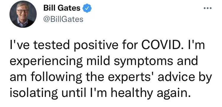 当地时间5月10日,美国微软公司创始人比尔·盖茨通过社交媒体称其新冠病毒检测结果呈阳性,目前症状轻微,正处于隔离状态。