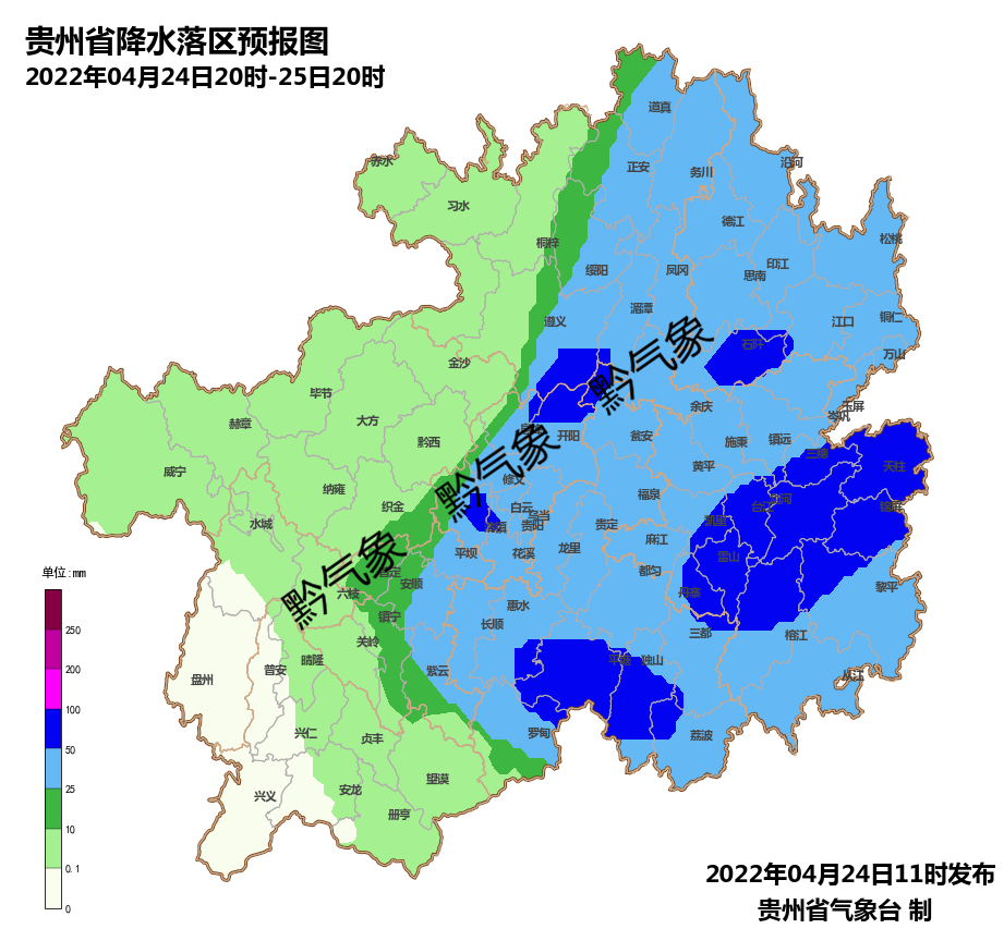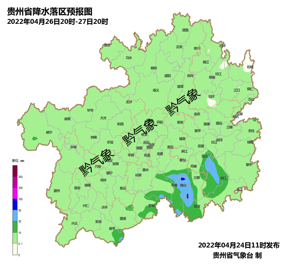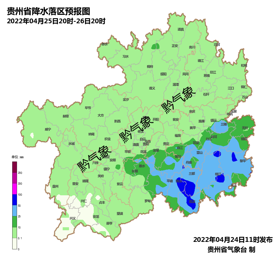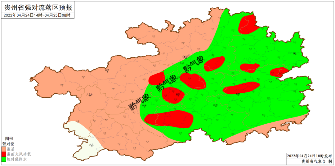 24日14时-25日08时,全省大部有雷电天气,其中遵义市东部和南部、铜仁市南部、黔东南州中北部、贵阳市、毕节市东部、安顺市东部、黔南州北部和西南部雷雨中伴有雷暴大风、冰雹及短时强降水等强对流天气。