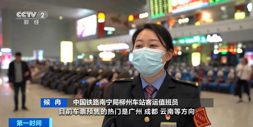 中国铁路南宁局柳州车站客运值班员 候冉:目前车票预售的热门是广州、成都、云南等方向。预计整个五一假期,柳州站增加南宁、贺州等方向6趟车。
