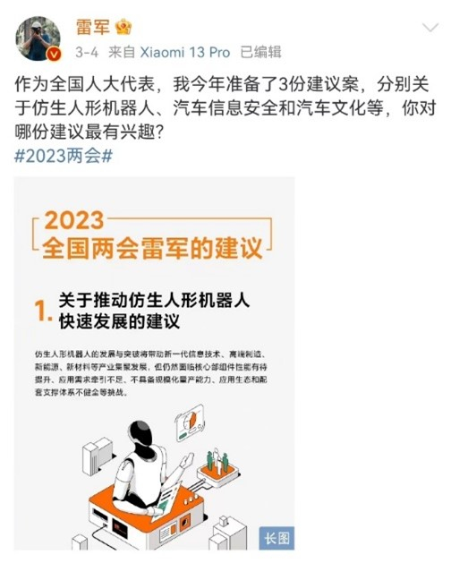 社交平台发布建议后,“雷军两会建议推动仿生机器人发展”话题冲上热搜,不少网友点赞。
