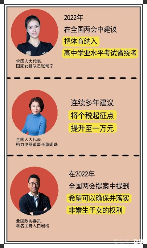 如2022年全国人大代表、国家女排队员张常宁建议把体育纳入高中学业水平考试省统考;全国人大代表、格力电器董事长董明珠连续多年建议,将个税起征点提升至一万元;全国政协委员、著名主持人白岩松在2022年全国两会的提案中提到,希望可以确保并落实非婚生子女的权利。
