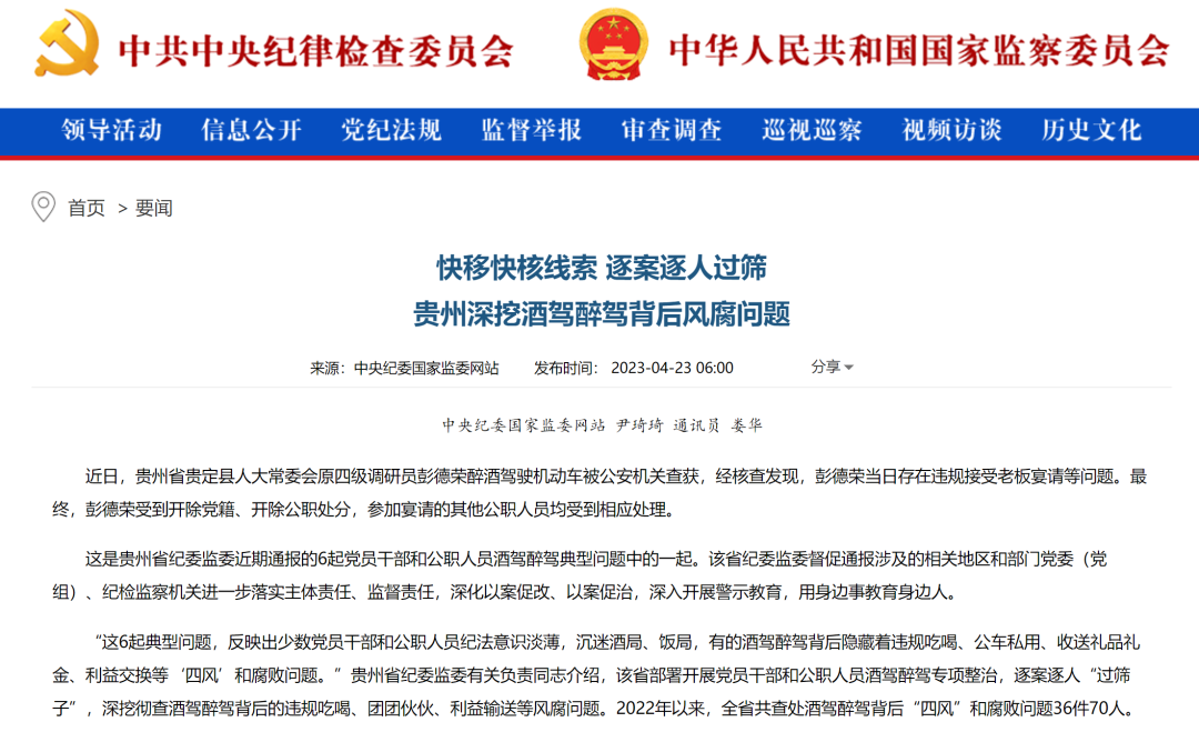 这是贵州省纪委监委近期通报的6起党员干部和公职人员酒驾醉驾典型问题中的一起。该省纪委监委督促通报涉及的相关地区和部门党委(党组)、纪检监察机关进一步落实主体责任、监督责任,深化以案促改、以案促治,深入开展警示教育,用身边事教育身边人。