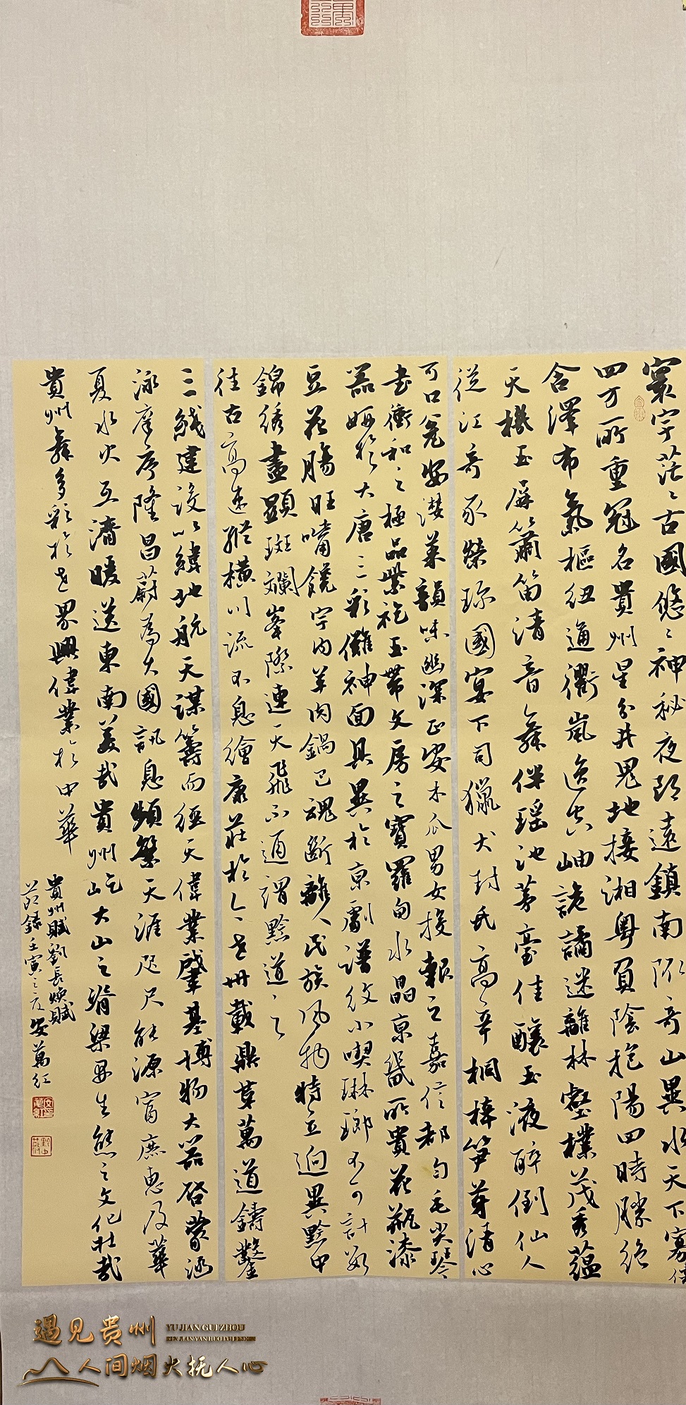 作品创作以刘长焕先生的《多彩贵州赋》为创作内容,笔法以“二王”为基,兼融赵孟頫、米芾笔意。品读此作可卧游黔中山水,饱览名胜古迹,结交高人奇土,观赏霓裳傩面,静听笙歌箫笛,品尝小吃土产。上下古今、城邑乡野、名物风景尽收眼底,多角度全方位地展现了贵州的多彩。