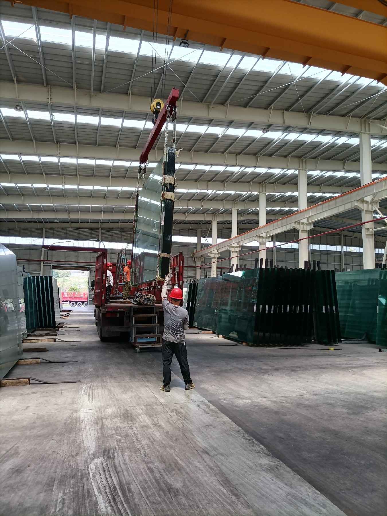 机器轰鸣中,工作人员正在娴熟作业,把包装好的高端玻璃成品慢慢移动到车上,随后满载玻璃的一辆辆大货车相继驶离成品车间,整装待发向粤港澳大湾区进发。