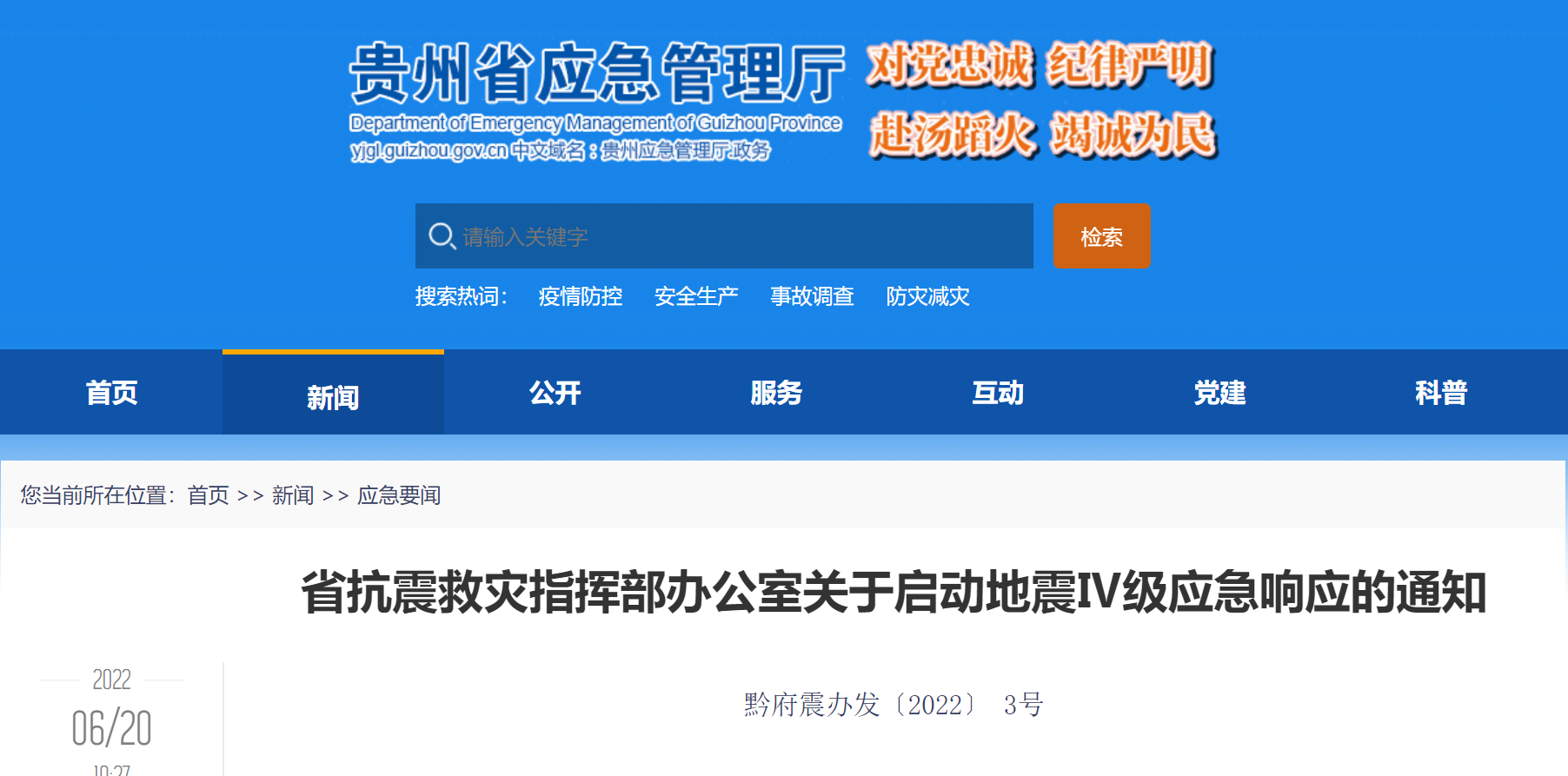 据中国地震台网正式测定:2022年6月20日6时40分在贵州毕节市威宁县中水镇附近(北纬27.21度,东经103.75度)发生4.4级地震,震源深度12公里。按照《贵州省地震应急预案》有关规定,省抗震救灾指挥部办公室决定从6月20日9时启动地震Ⅳ级应急响应。各有关部门要迅速分析研判地震趋势,加强震后隐患排查,查清受灾情况,会商研究处置措施,严密防范地震可能引发的次生灾害和生产安全事故。