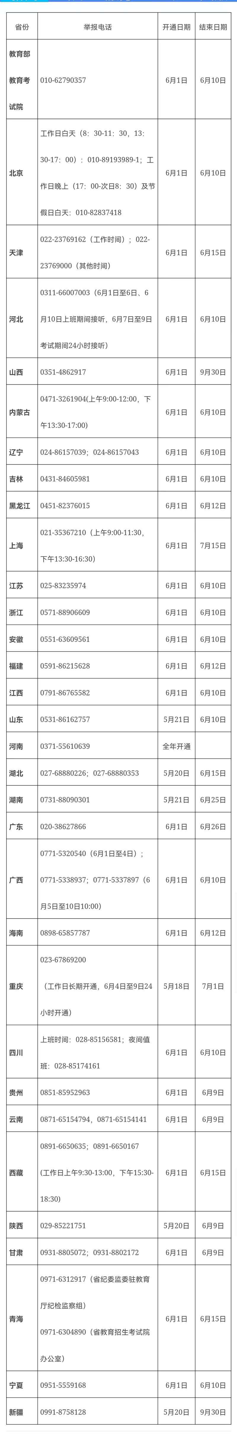 记者从教育部获悉,教育部统一公布了教育部以及省级教育行政部门和招生考试机构2022年的高考举报电话,广大考生、家长及社会各界人士可以通过举报电话及时举报反映涉及2022年高考的问题线索。