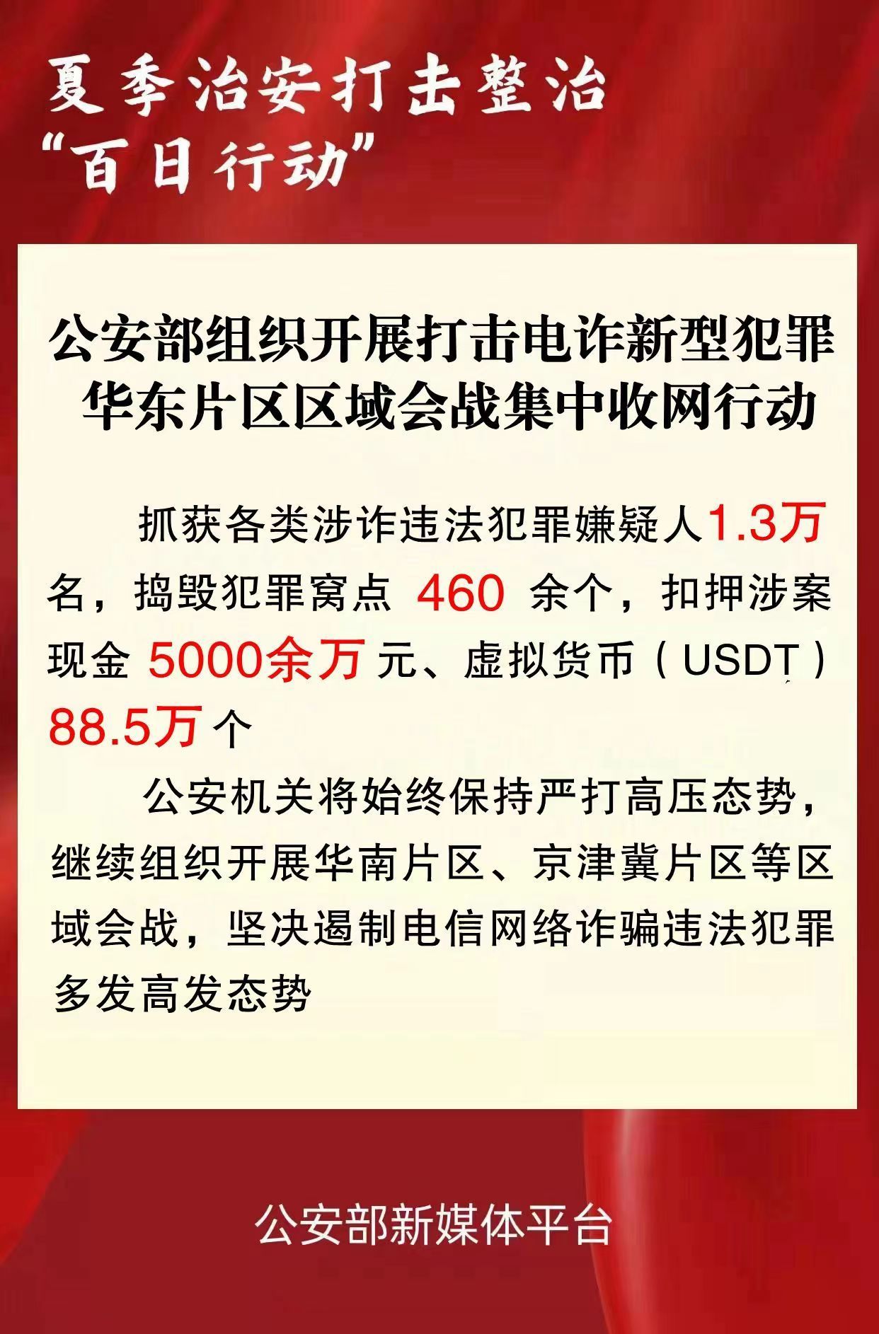 记者从公安部获悉:为深入推进夏季治安打击整治“百日行动”,依法严厉打击电信网络诈骗新型违法犯罪,近日,公安部组织指挥江苏、浙江、安徽3省15市公安机关同步开展华东片区区域会战集中收网行动,成功抓获各类涉诈违法犯罪嫌疑人1.3万名,捣毁犯罪窝点460余个,缴获手机、电脑、“两卡”等作案工具1.4万个(台),扣押涉案现金5000余万元、虚拟货币(USDT)88.5万个,有效净化了社会治安环境。