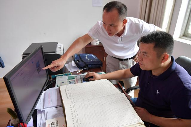 在江西省乐平市退役军人事务局,程雪清(左)在工作人员帮助下上网查找烈士资料(7月6日摄)。新华社记者 彭昭之 摄