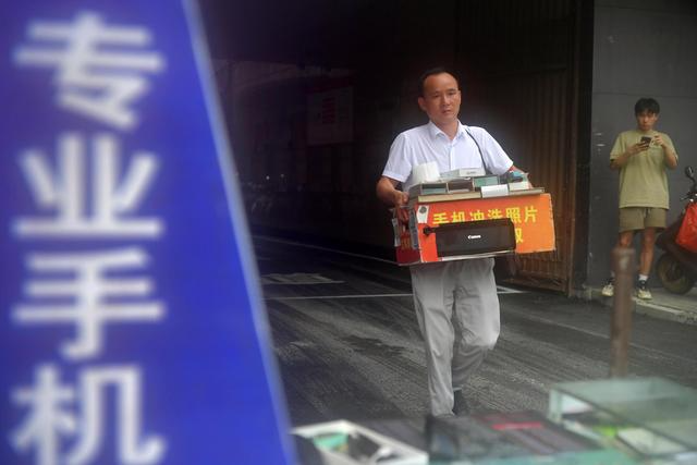 在江西省乐平市街头,程雪清抱着他的电脑和工具箱准备开始摆摊做生意,多年来,他一直从事手机贴膜的工作(7月7日摄)。新华社记者 彭昭之 摄