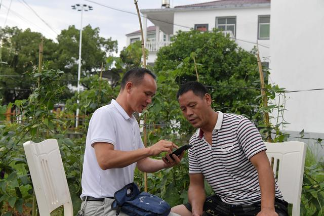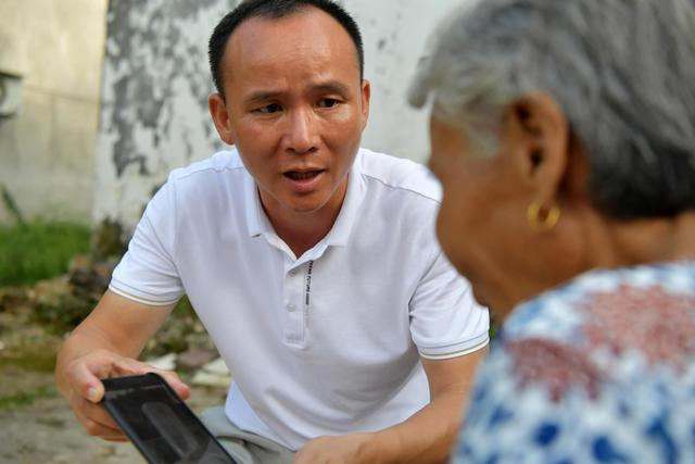 在江西省乐平市后港镇磻溪村,程雪清在抗美援朝烈士王来松的侄儿王光亮家中向他介绍寻访烈士墓地的过程,并将位于朝鲜开城的烈士墓地的照片给他看(7月6日摄)。新华社记者 彭昭之 摄