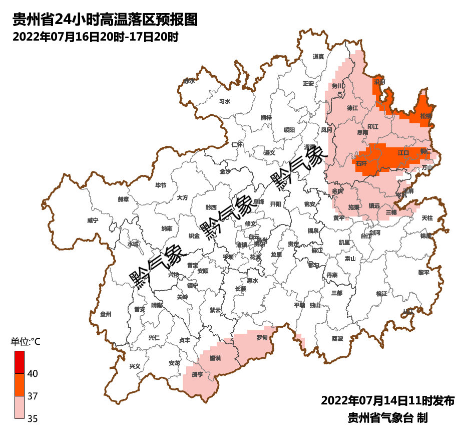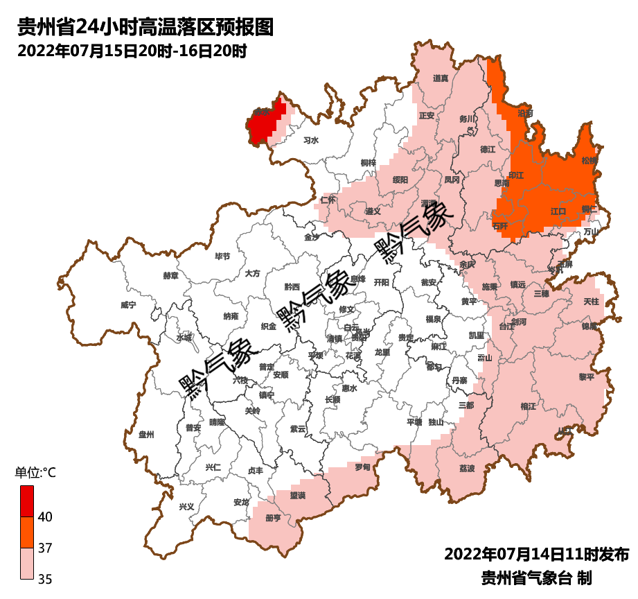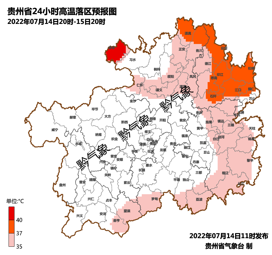 高温天气主要出现在铜仁市、遵义市、黔东南州、黔南州南部及黔西南州东南部。