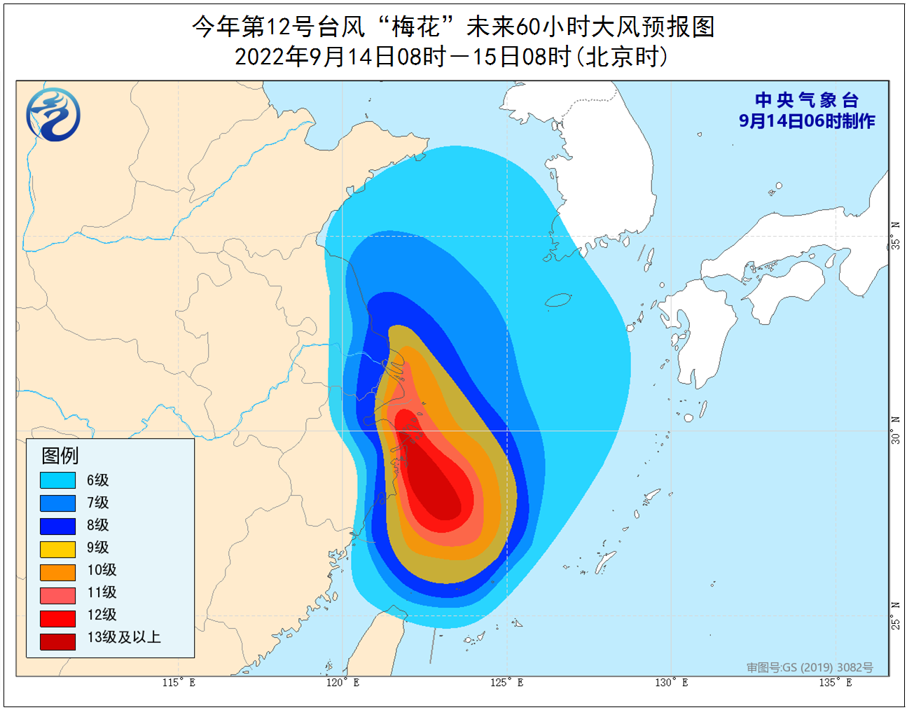 大风预报:9月14日08时至15日08时,东海大部及钓鱼岛附近海域、黄海中南部海域、长江口区、杭州湾以及台湾岛北部沿海、福建北部沿海、山东南部沿海、浙江东部、上海、江苏东部沿海和地区将有6-8级大风,阵风9-11级,其中东海中西部海域、浙江中北部沿海、上海沿海、江苏东南部沿海、杭州湾、长江口区将有9-11级大风,阵风12-14级,“梅花”中心经过的附近海面或地区的风力有12-14级,阵风可达15-16级。