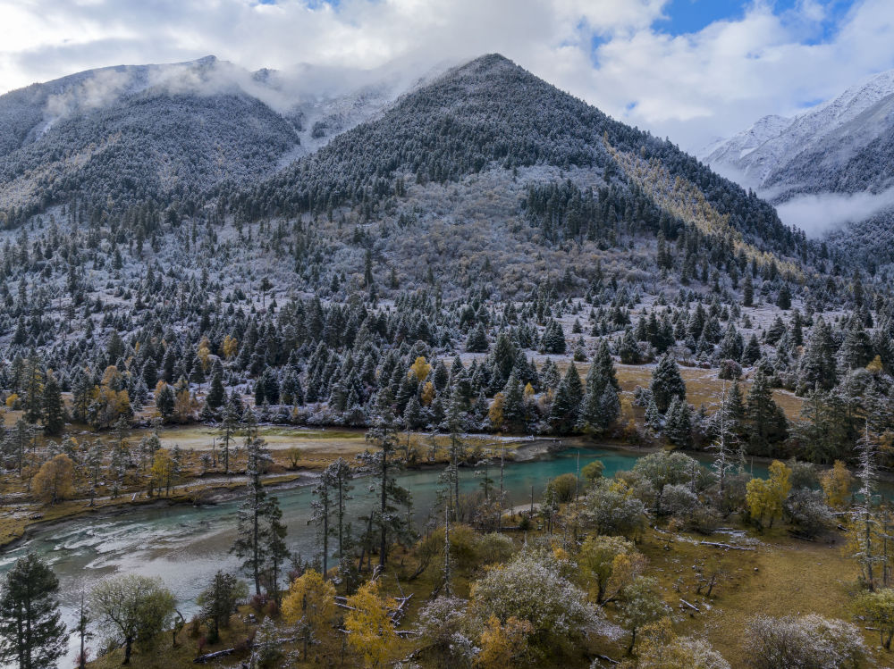 时值金秋,西藏林芝市秋色已浓,黄叶与初雪交织,流水并雪山辉映,景色如诗如画。